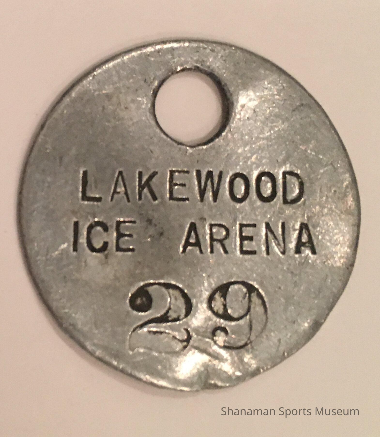 A locker tag from the Lakewood Ice Arena was used by patrons to store their possessions while using the skating facility. The ice arena was home to many popular sports played at the rink including hockey, curling and figure skating. The ice arena was the entertainment hub from its opening in 1938 until 1982 when part of the building collapsed and the rest was demolished.Lexicon