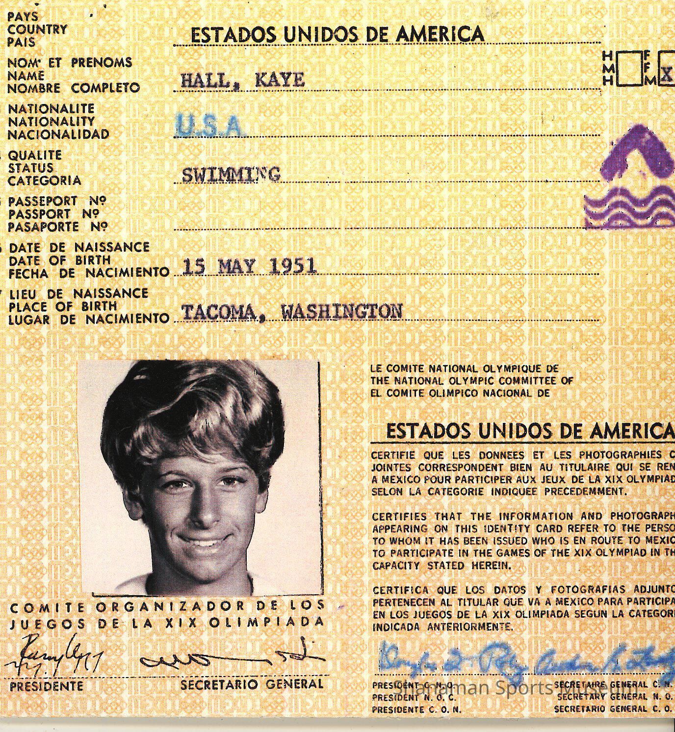 Photo, I.D. belonging to swimmer Kaye Hall, facsimile from the 1968 Olympics