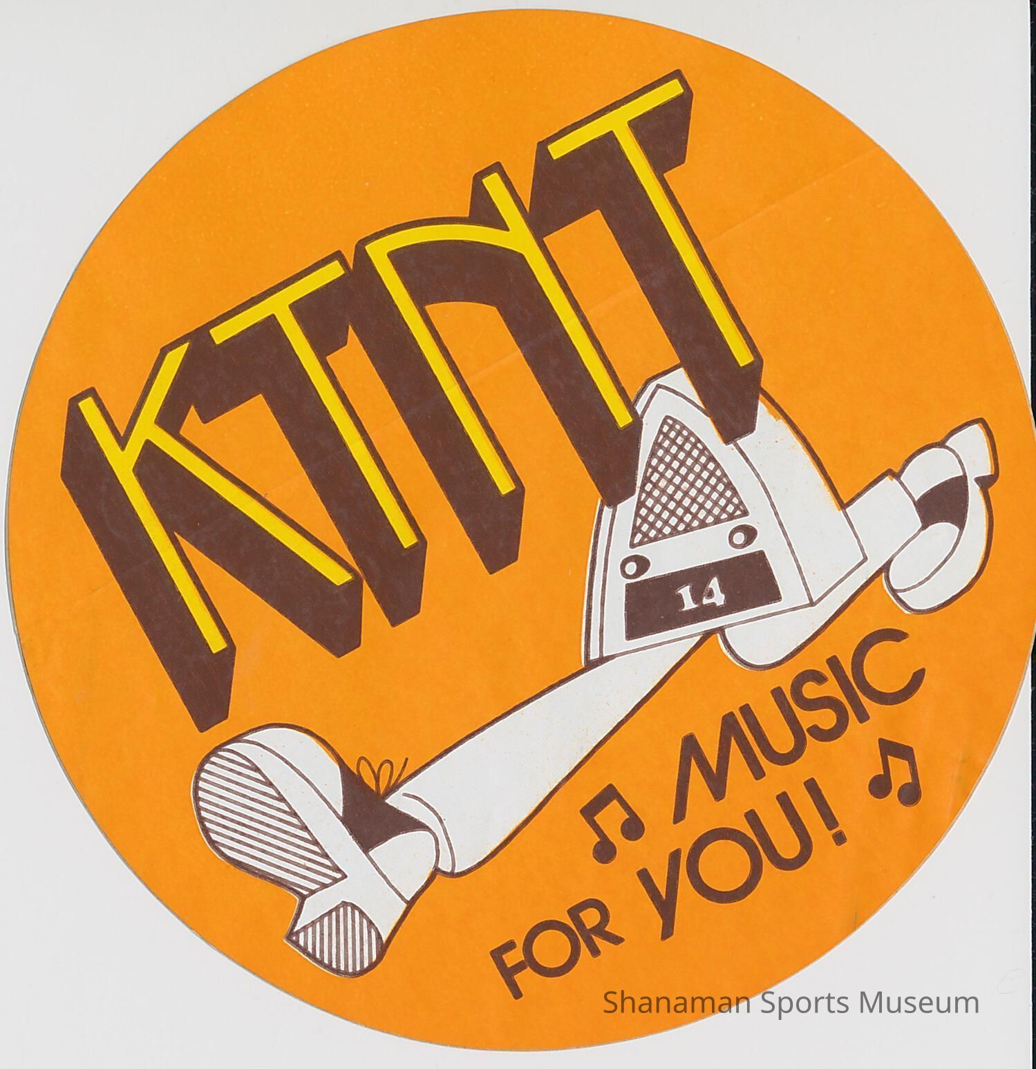The sticker says “Music for you!” with two music notes for accents, and a logo of a radio with two walking legs. Written on the back of the sticker covering is KTNT sticker 1978.