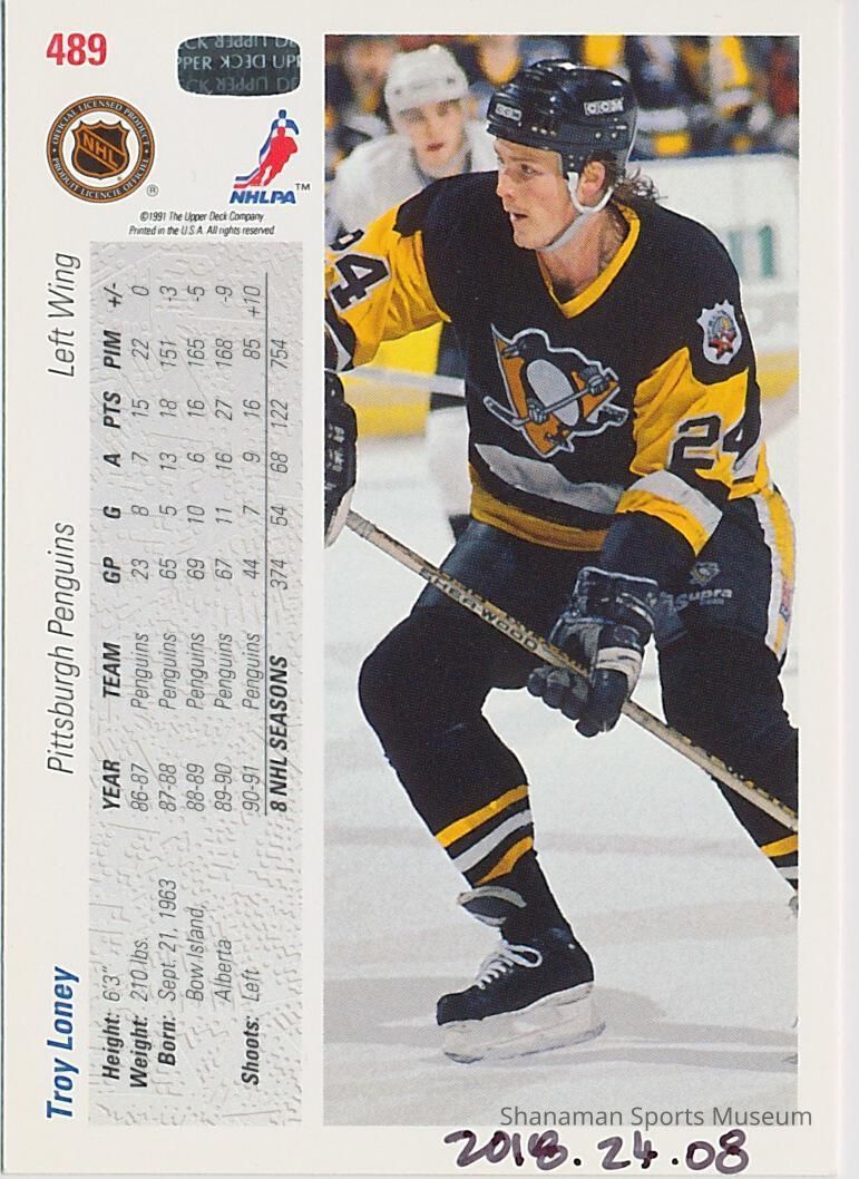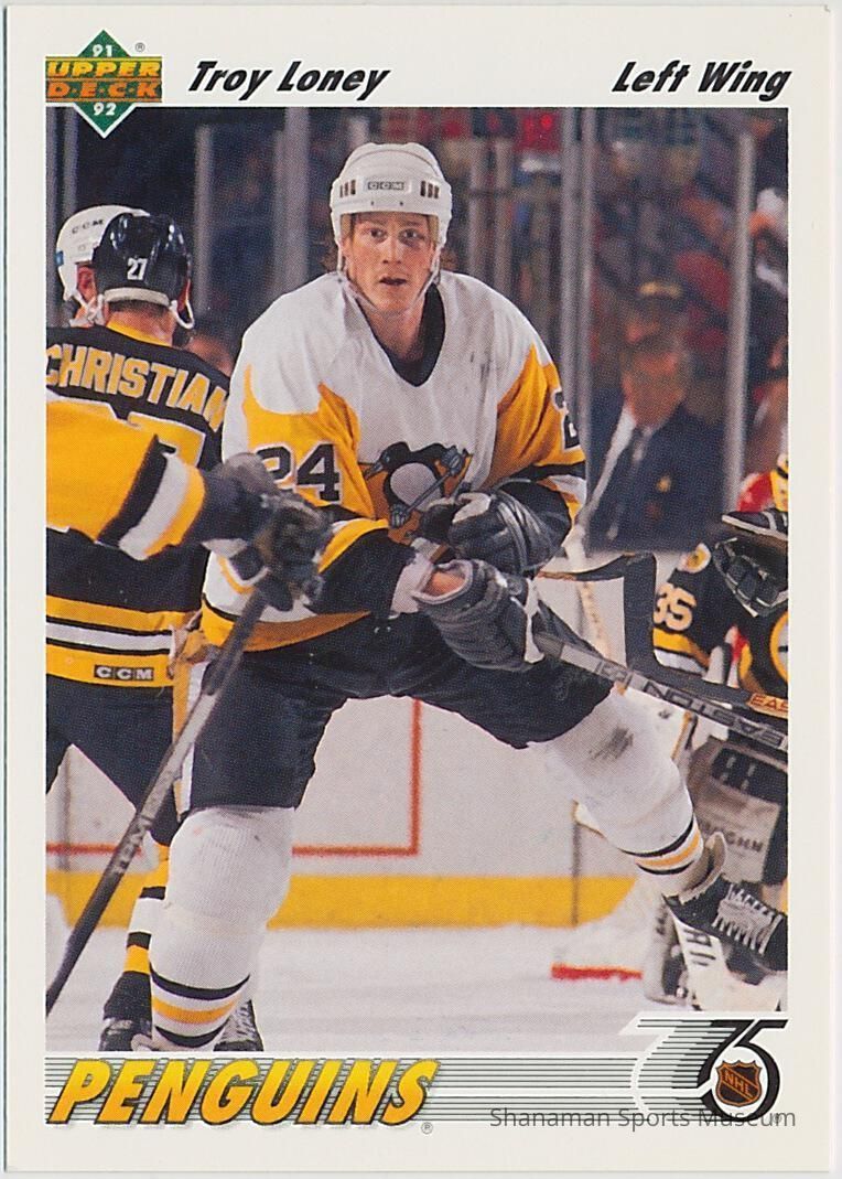 Troy Loney, seen on his 1991-92 Upper Deck trading card donated by Roger and Carolyn Erickson, was a 10th round pick of the Pittsburgh Penguins in the 1982 NHL Draft. Loney played 10 seasons with the Penguins before playing one season with Anaheim, New York Islanders and New York Rangers. Loney won two Stanley Cup Championships with the Penguins in 1990-91 and 1991-92.