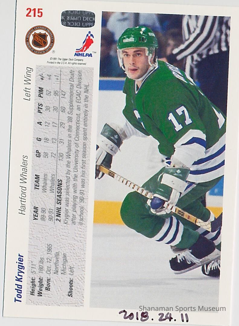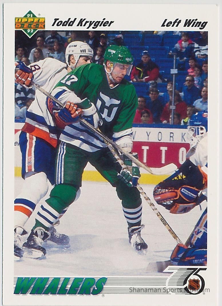 Todd Krygier, seen on his 1991-92 Upper Deck trading card, started his 10-year career with the Hartford Whalers in 1989, but has his best season as an Anaheim Ducks in 1995-96. Krygier amassed 37 points, including 28 assists. He finished with 100 goals and 143 assists for his career.