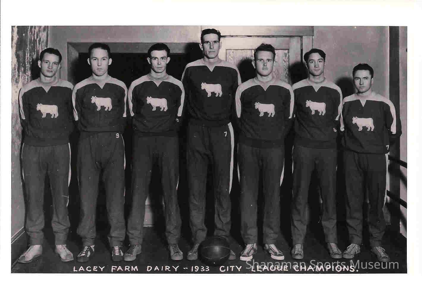 This is a black-and-white photo taken in 1933 of the Lacey Farm Dairy basketball team that won the city league championship. Fred Osmers is the first player on the left. He was an outstanding basketball and handball player in the 1920s and 1930s and he went on to own the Northwestern Drug Company. Osmer later played on the 1940 Tacoma Elks handball team.Lexicon