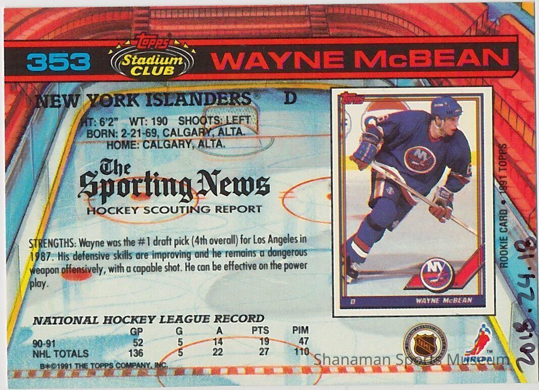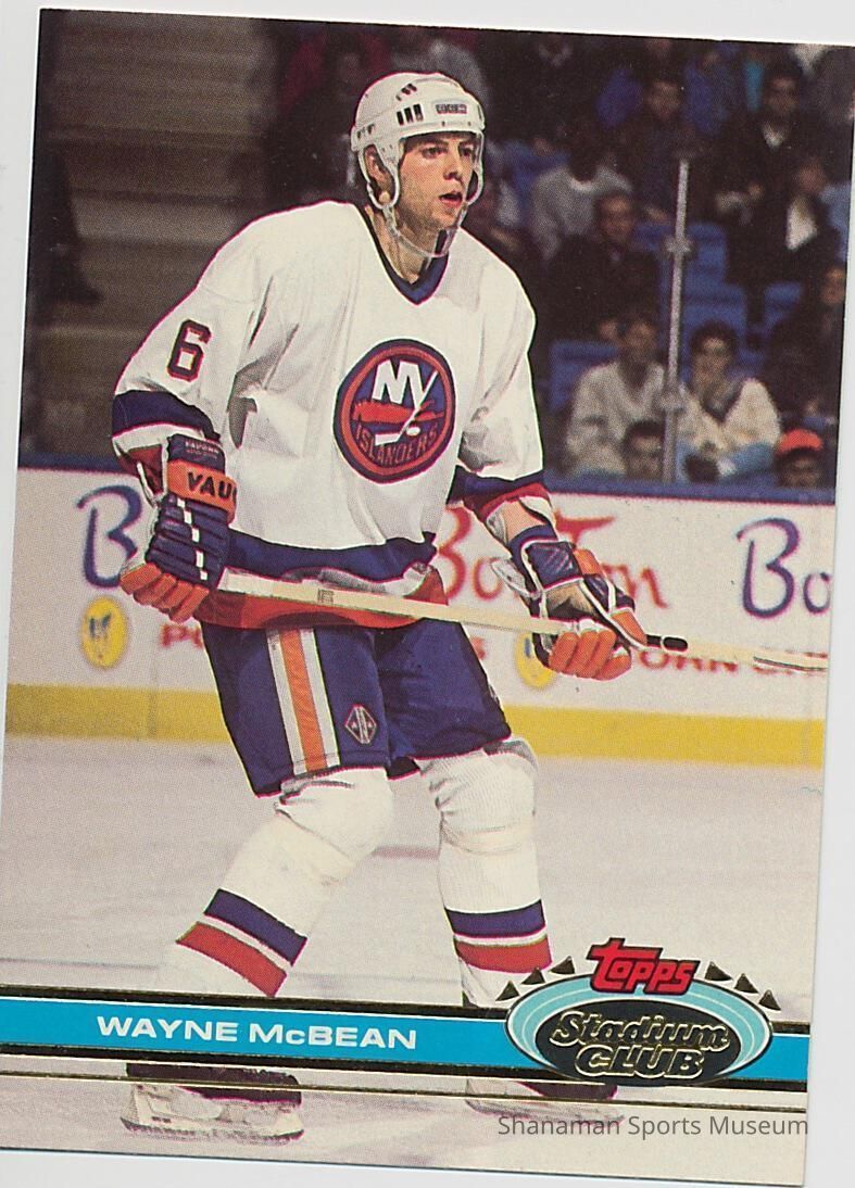 Defenseman Wayne McBean was a 1987 draft pick of the Los Angeles Kings, having been selected fourth overall. McBean, was the Kings’ first draft choice and went on to play six seasons with the New York Islanders — which he’s shown on his Topps Stadium Club in 1990-91. McBean’s strongest season came in 199091 when he was responsible for keeping opponents off the scoreboard with a minus rating of -21 while on the ice.