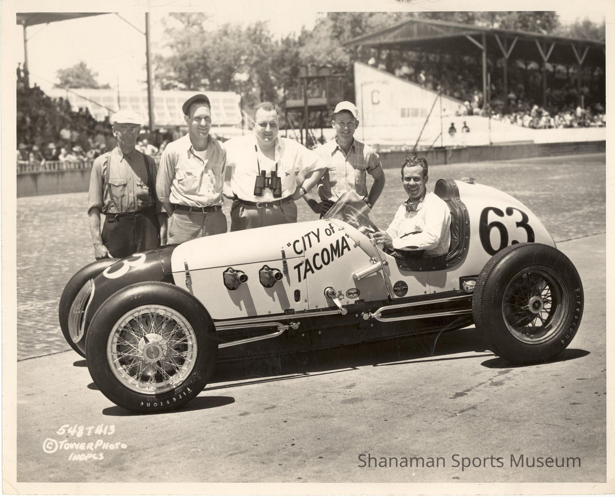 In this 1948 black-and-white photo, driver Hal Cole sits in his race car, No. 63. Standing behind from left to right are, Joe Johnson, Ralph Taylor, Tom Carston and an unidentified person. Cole led this race in Tacoma for the first 29 laps, but then the rear-end of his car gave out and he finished sixth.
