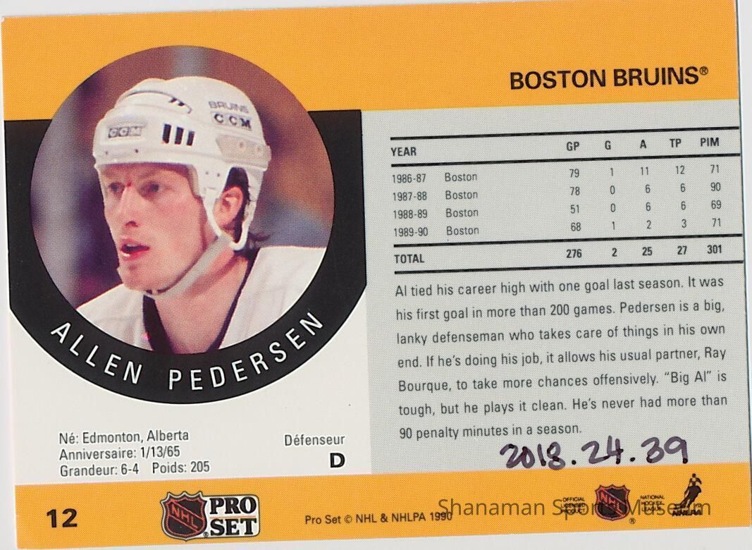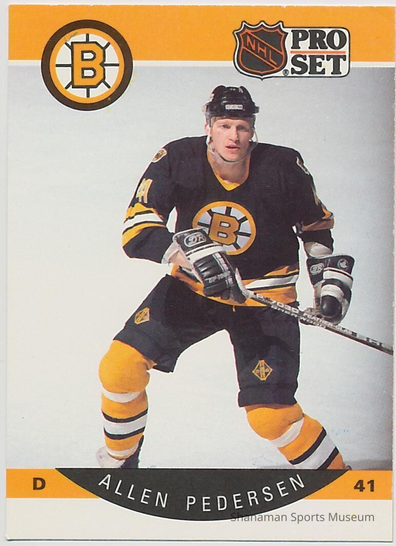 Allen Pedersen, a six-foot-four defenseman, pictured in his NHL Pro Set trading card donated by Roger and Carolyn Erickson, was an Alberta native selected in the fifth round of the NHL Draft in 1983. Pedersen played five seasons with the Bruins before being traded to Minnesota for one season (1991-92) and then Hartford for two years (1992-94). He finished his career with 487 penalty minutes in 428 games.