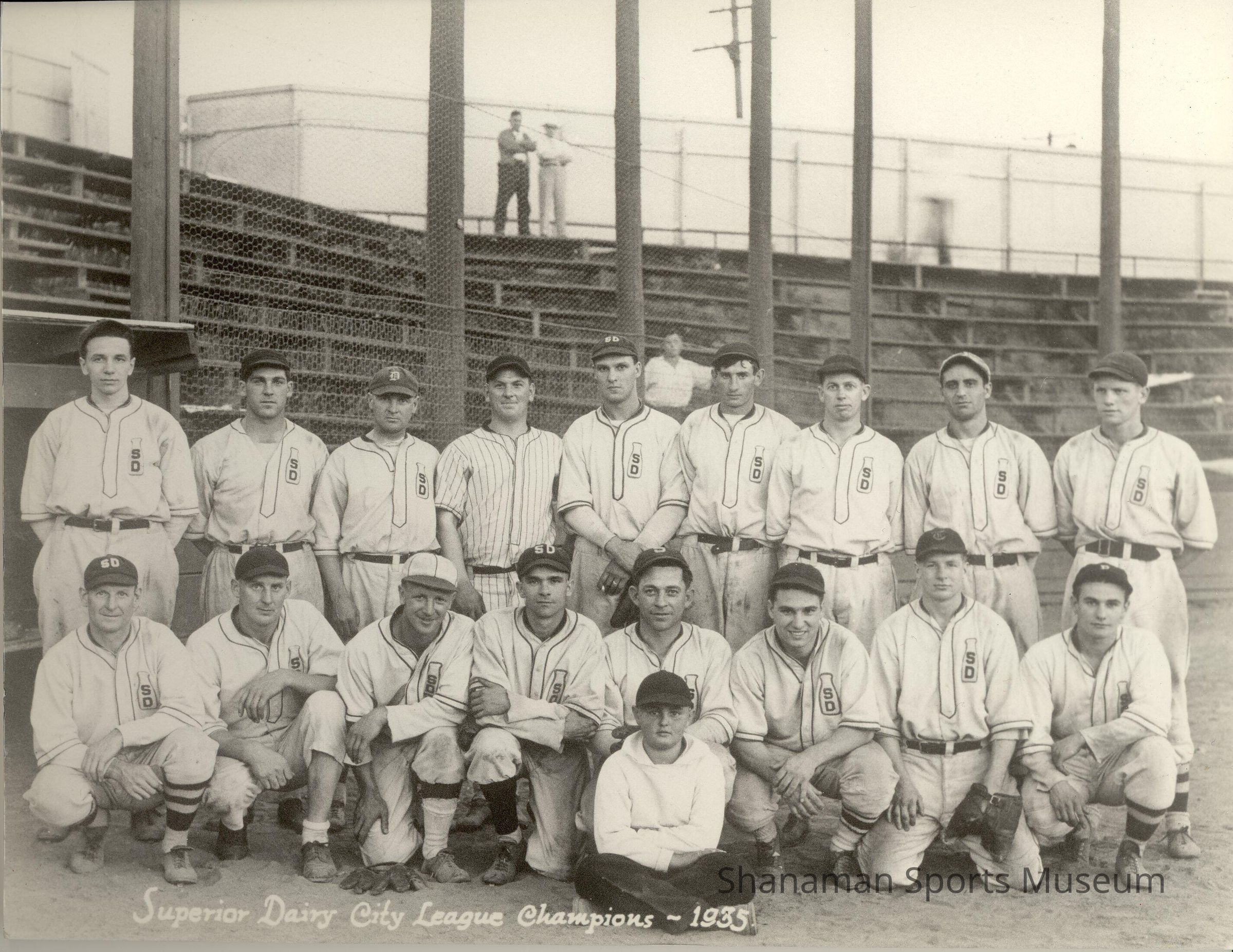 Standing in front of some empty bleachers, this Superior Dairy baseball team that won the city league championship in 1935 poses for a team photo. Oscar (Ocky) Haugland, who is in the bottom far left in the photo, was the team manager and a fill-in player. Haugland was an outstanding baseball player and he was inducted into the Tacoma-Pierce County Sports Hall of Fame in 1971. Over the years, Bill Moe also played for Superior Dairy under Haugland. At just 15 years old, Moe started playing for a semi-pro county baseball team called the Kirby Pirates. He played for 23 years but never made it to the major leagues.
