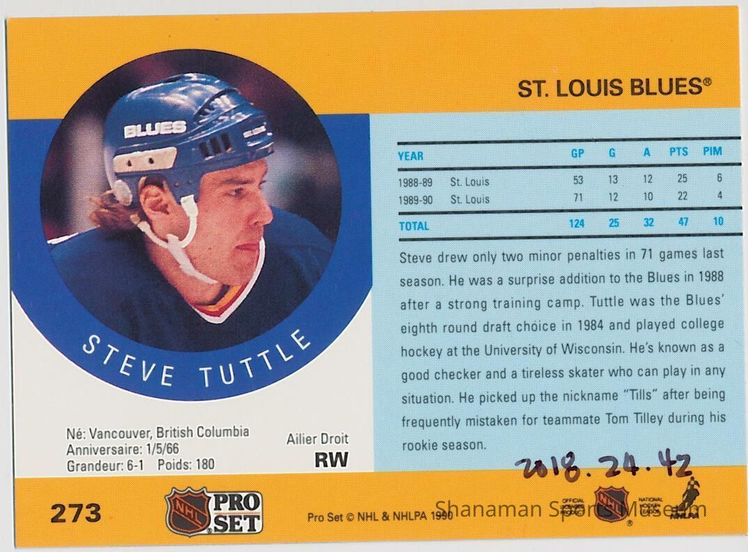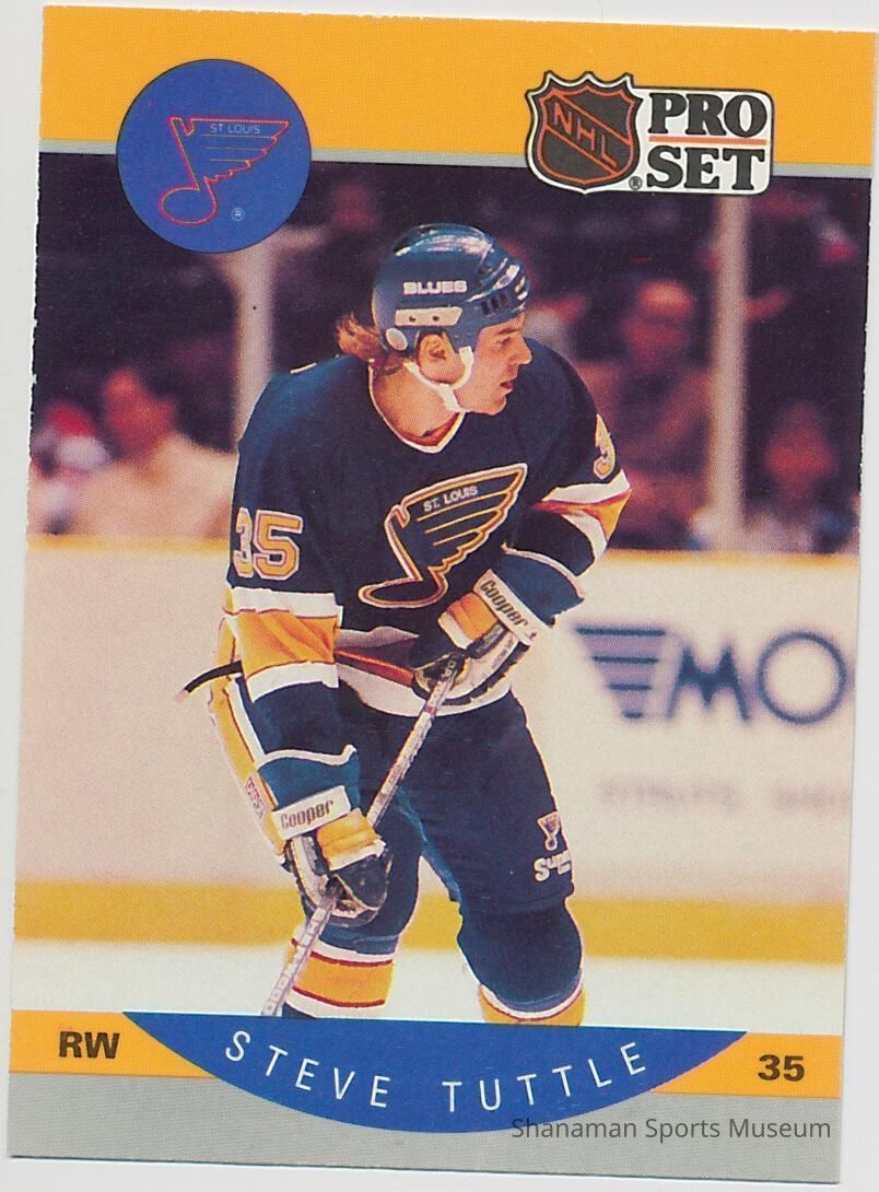 Steve Tuttle, pictured in his NHL Pro Set trading card donated by Roger and Carolyn Erickson, was a 1984 eighth-round draft pick by the St. Louis Blues and played collegiately at the University of Wisconsin. Tuttle, a native of Vancouver, B.C., played just three seasons in the NHL, all for St. Louis. He amassed 56 points in 144 games.Lexicon