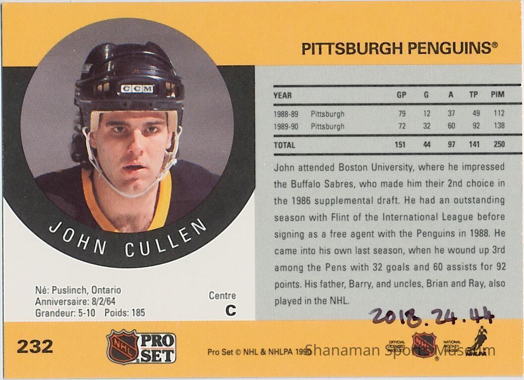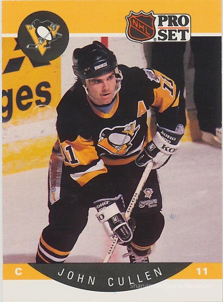 John Cullen went undrafted, but wound up with a solid 11-year career that saw him notch 550 total points. Cullen, a 5-foot-10, 180-pound center, signed with Pittsburgh where he started his career in 1988. He went on to play for Hartford, Toronto, back to Pittsburgh, and Tampa Bay. Cullen, pictured in his NHL Pro Set trading card donated by Roger and Carolyn Erickson, had his best season in 1990-91 when he recorded 94 points (31 goals, 63 assists) for the Penguins.Lexicon