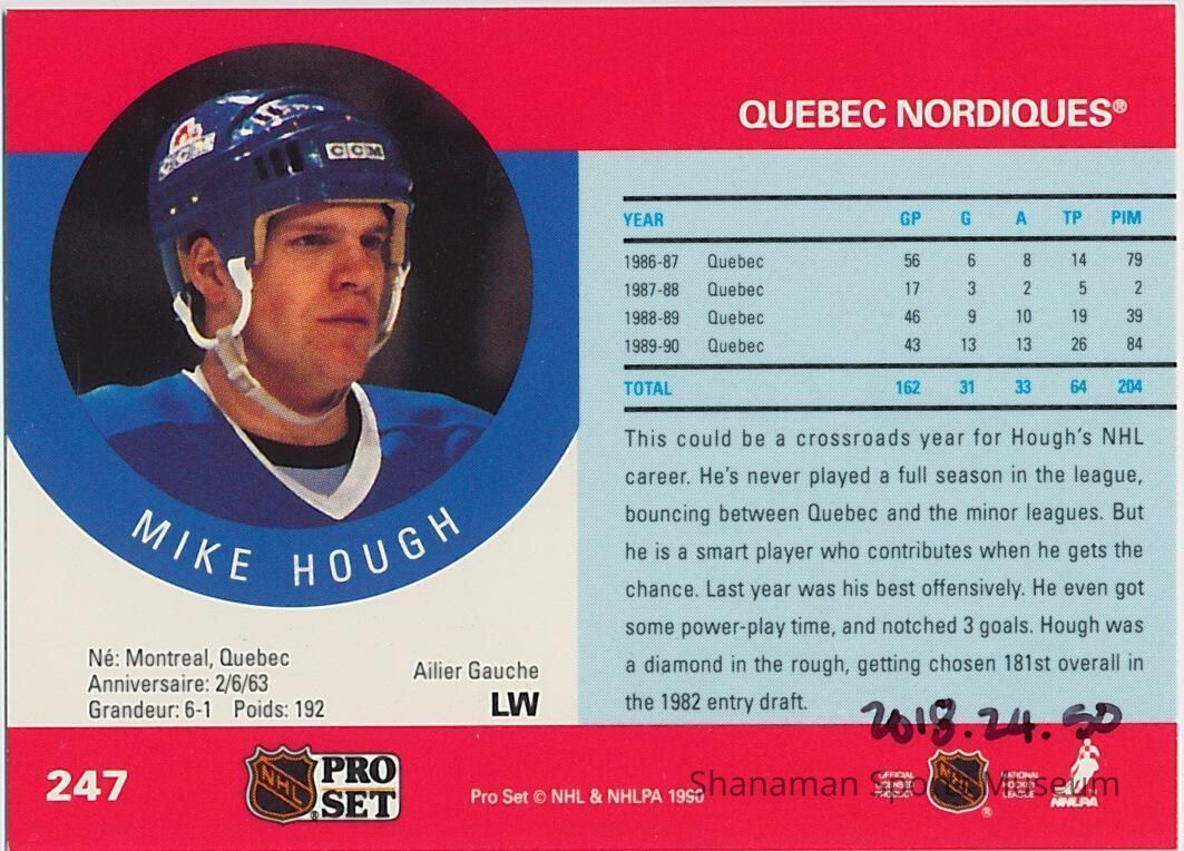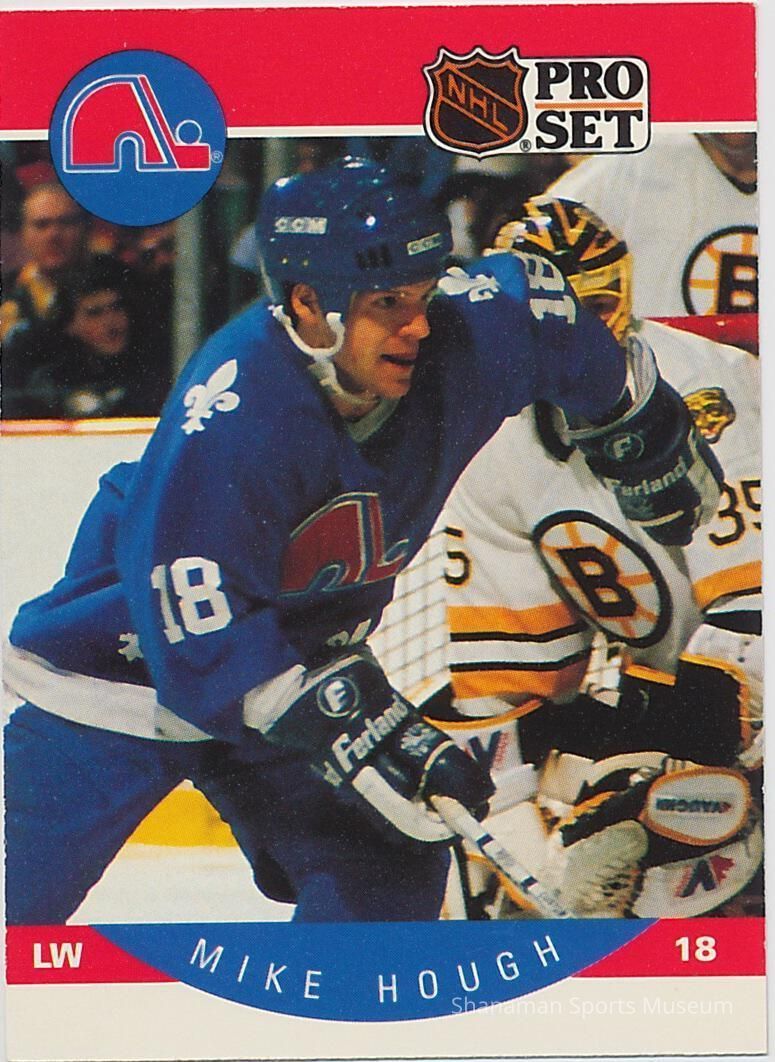 Mike Hough, pictured in his NHL Pro Set trading card donated by Roger and Carolyn Erickson, was a ninth-round draft pick by the Quebec Nordiques in 1982. Hough, a 6-foot-1 left wing, totaled 707 games played with 256 points. Hough’s best season came in 1991-92 when he scored 38 points (22 assists).Lexicon