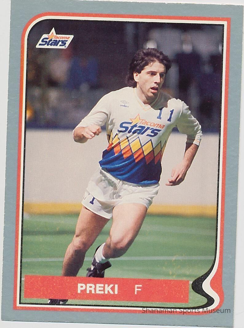 This is the front and back of the 1988 trading card of Tacoma Stars forward Preki.
