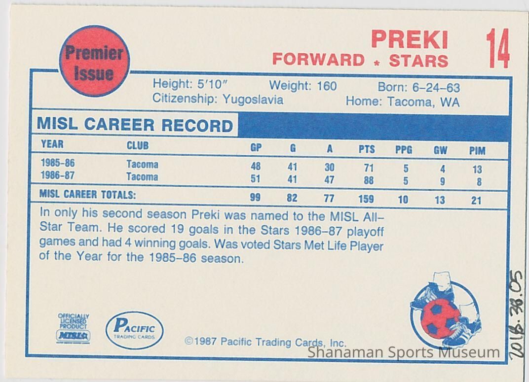 The back of the card has Preki’s biographical information (height 5-10, weight 160, born 6-24-63, citizenship Yugoslavia, home Tacoma, WA) and statistics for the 1985-86 and 1986-87 seasons (99 total games played, 82 goals, 77 assists, 159 points).