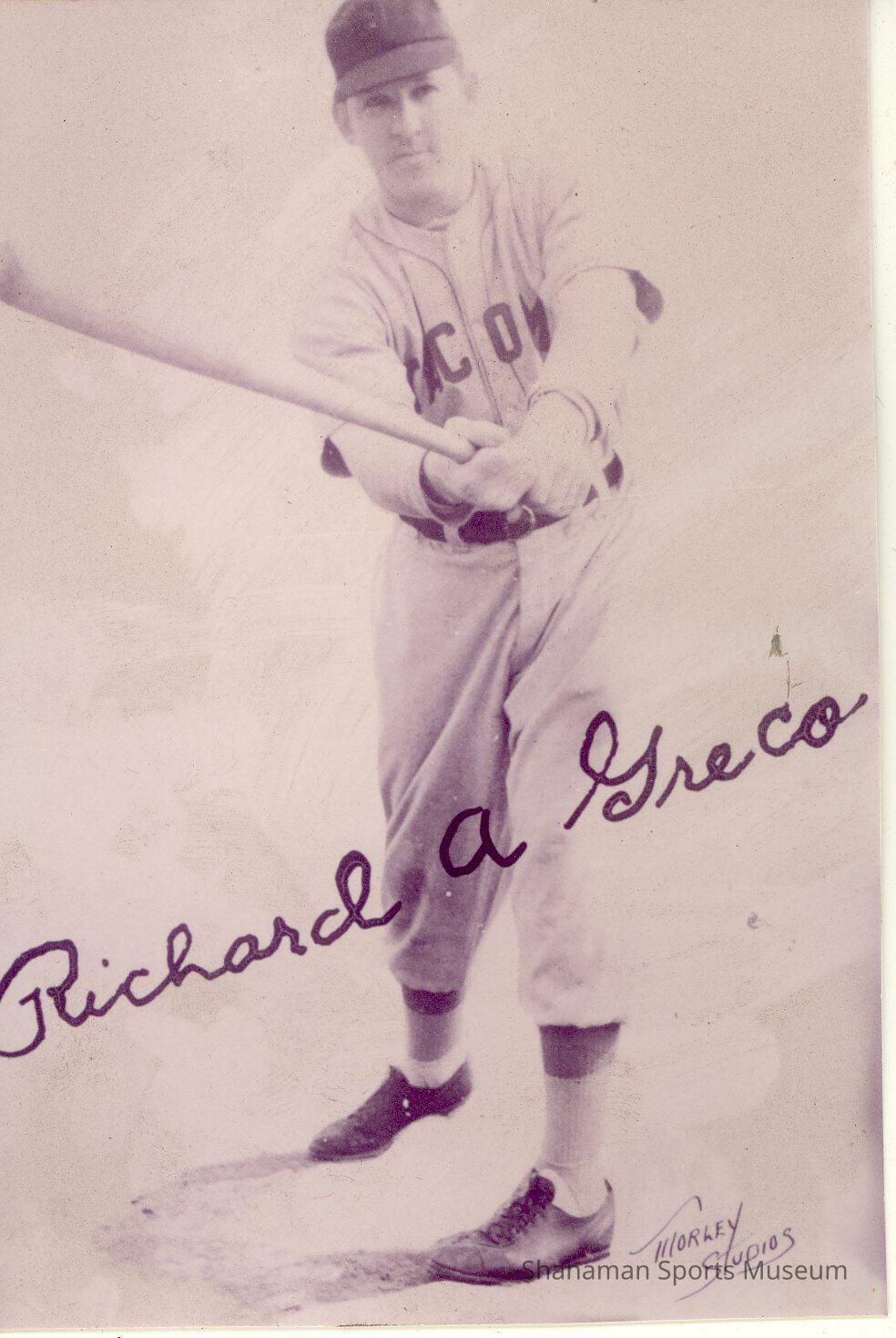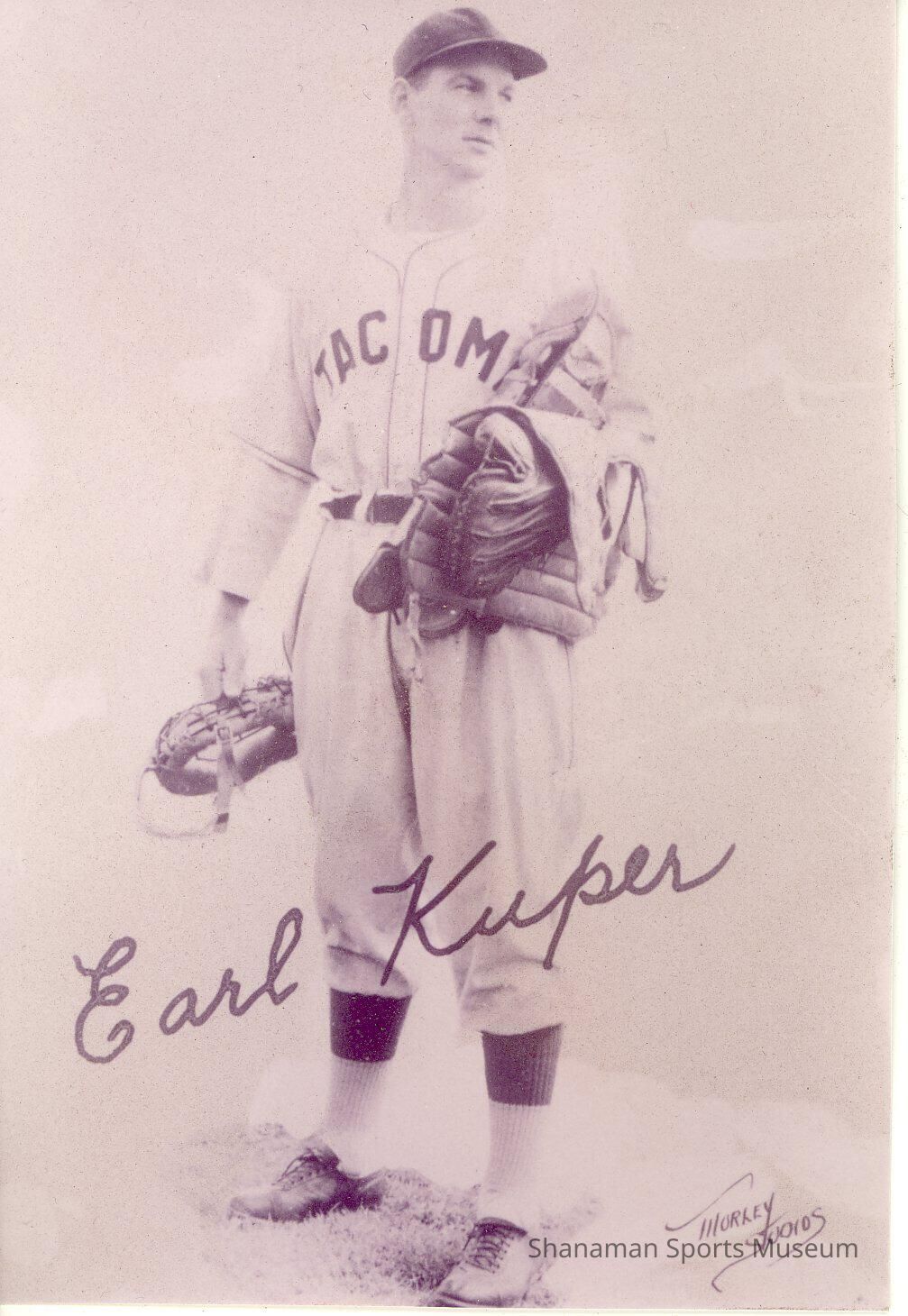 4 individual shots of the '46-47 Tacoma Tigers players. autographed. On display reproduced photo of Earl Kuper - Tacoma Tigers catcher - and Dick Greco. On file: Pete Sabutis, Cy Greenlaw and Richard Greco.