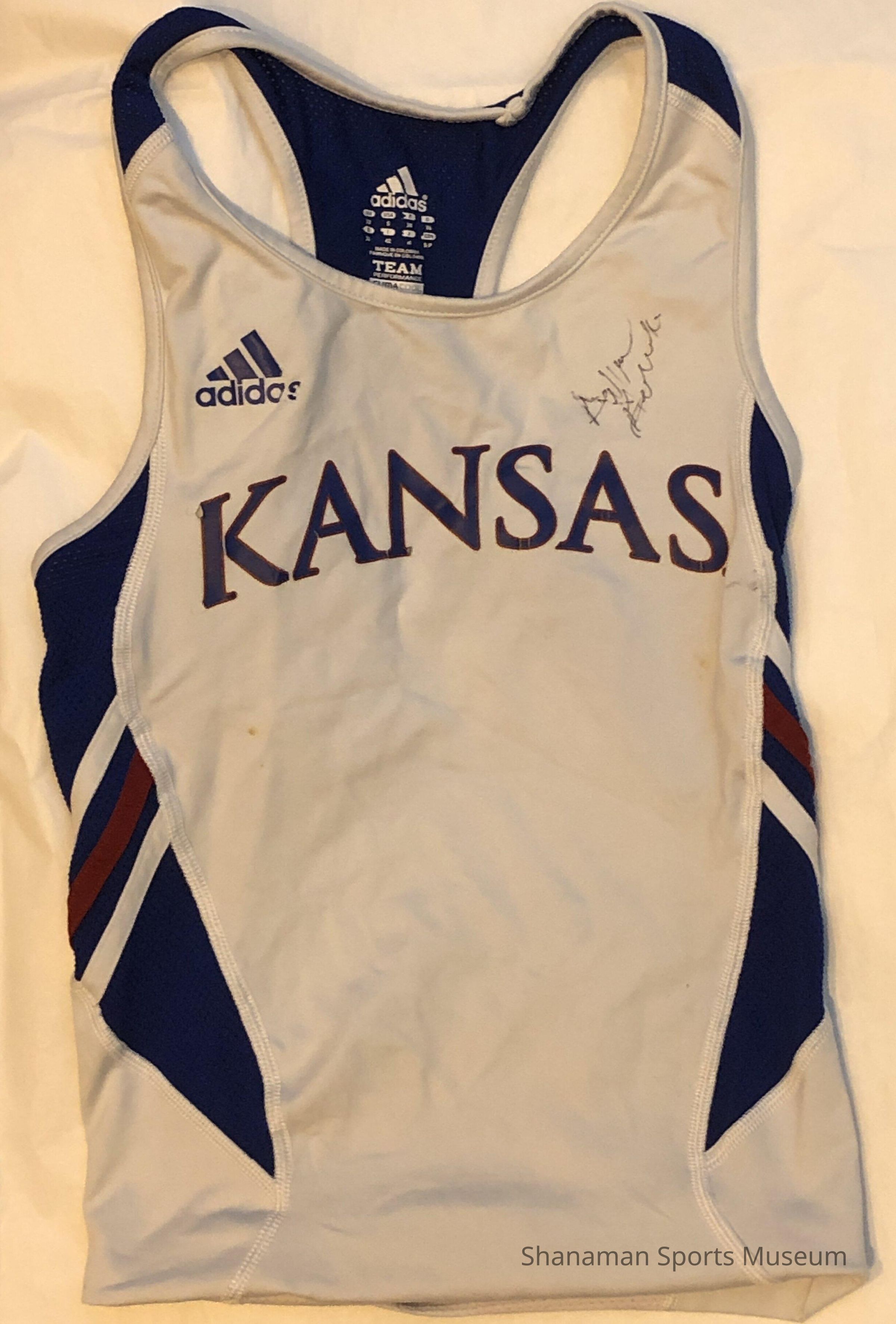 Kansas State University track and field Uniform worn by Andrea Geubelle. Geubelle was a standout track and field star at Curtis High School who competed for the University of Kansas and qualified for the U.S. Olympic team and participated at the 2016 Olympics in Rio. Geubelle, the daughter of Dawn DeCius and Jeff Geubelle, is a three-time NCAA Champion, finished the 2013 season ranked as the No. 1 female American triple jumper and placed 21st at the Olympic Games in 2016. She also earned a bronze medal at the 2016 USA Indoor Championships in the long jump, a silver in the 2014 USA Indoor Championships in the triple jump and a bronze in the long jump, and a gold at the 2013 USA Indoor Championship in the triple jump. At Curtis High, Geubelle won the 100m dash, the long jump and the triple jump her senior season.
