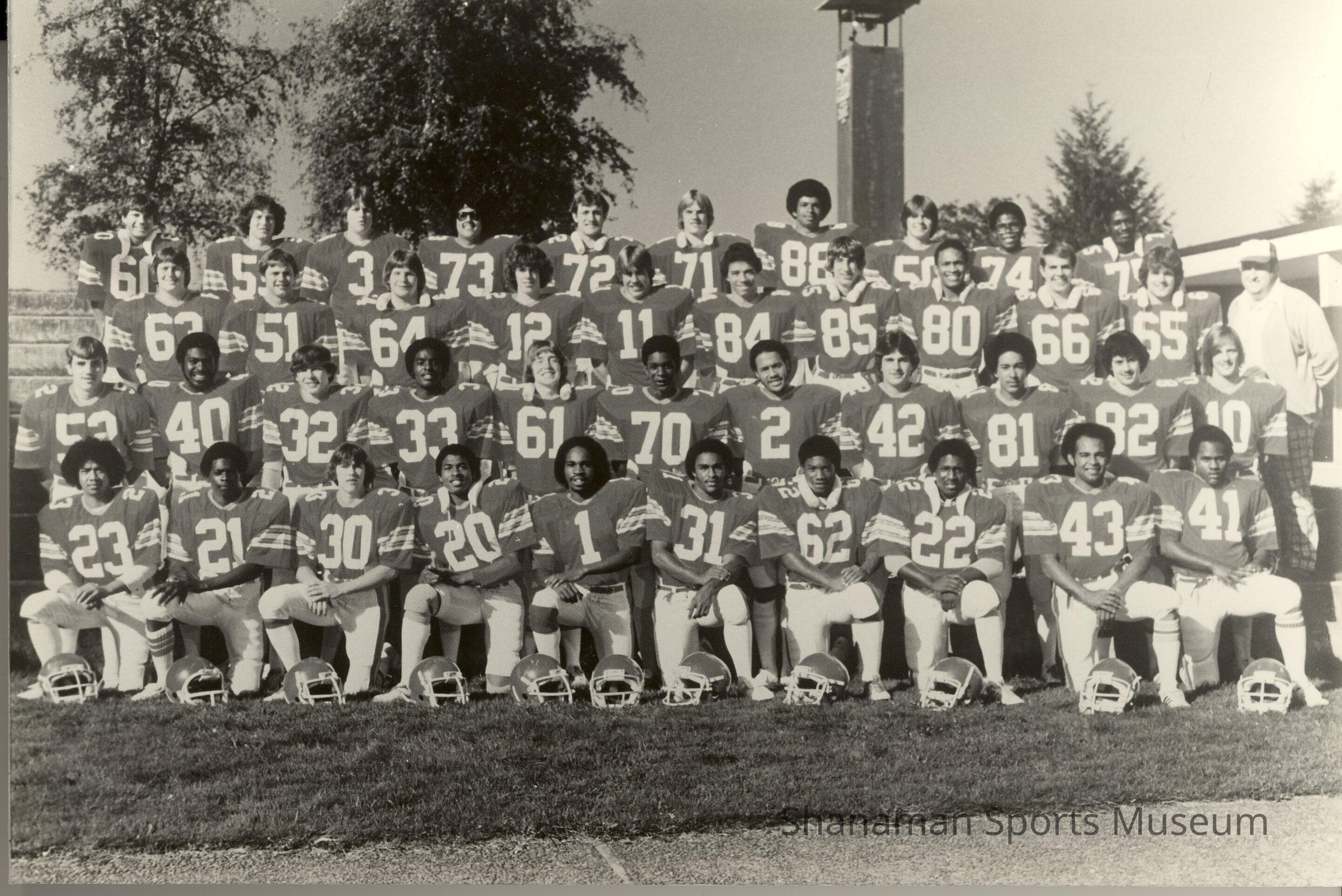 Coach George Nordi, right, and 41 football players from the 1980 state champion Mount Tahoma Thunderbirds pose for a team photo.