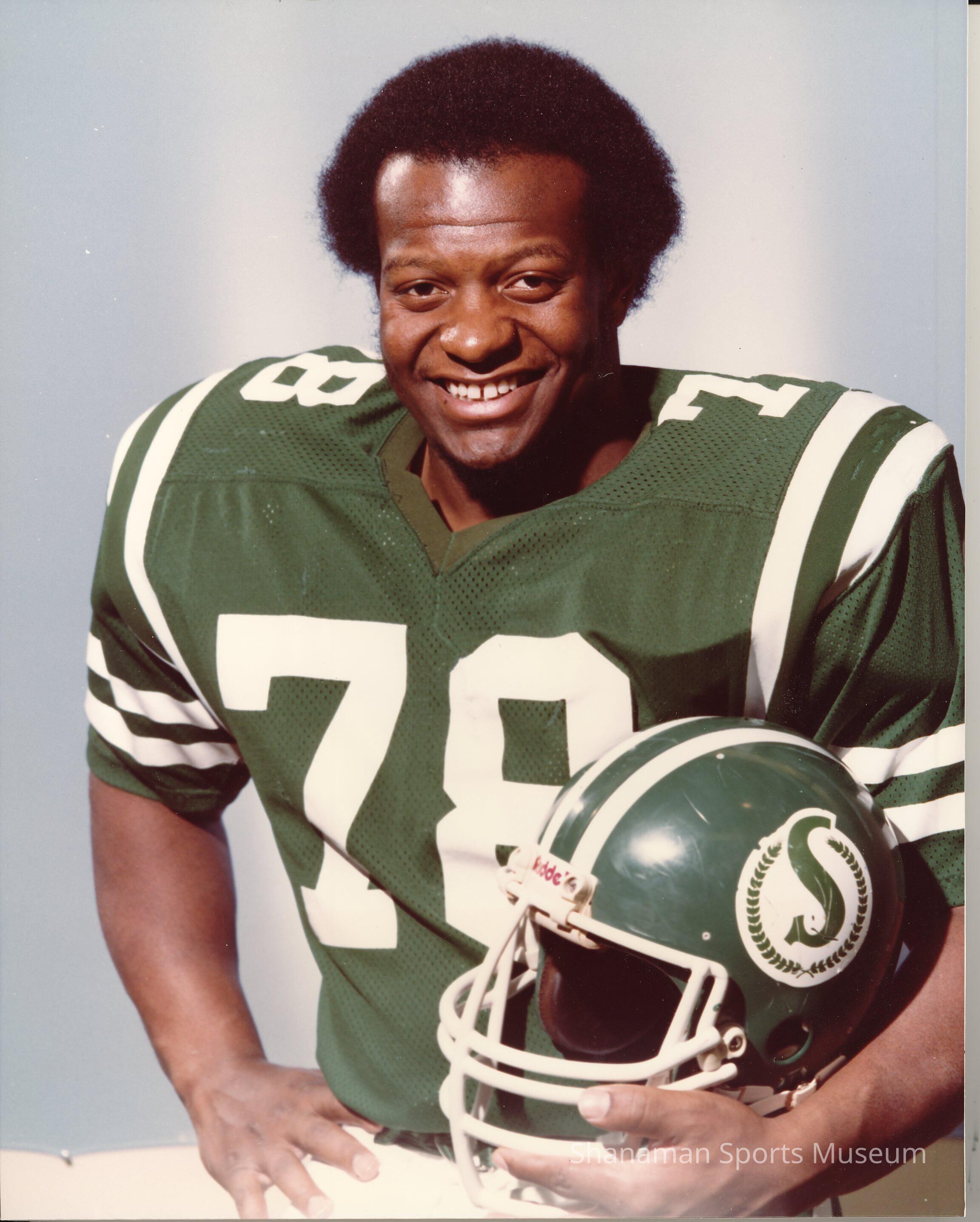 An in color team photograph of Vince Goldsmith while he was playing for Saskatchewan Roughriders in the Canadian Football League. He enjoyed a decade long career in the CFL, earning Rookie of the Year honors in 1981; Goldsmith was the Saskatchewan MVP and Outstanding Defensive Player in 1983, helped his team win the Grey Cup Championship in 1989. Goldsmith was an all-everything when he played for Mount Tahoma High School, earning All-City, All-State and All-American honors as he was with the T-Birds; he was a two-time state champion in the shot put while at Mt. Tahoma and still holds the state record of 69-feet, 11.5 inches. He played on the University of Oregon’s defensive line and was named Athlete of the Year in 1977 and was inducted into the Oregon Hall of Fame in 2002. Goldsmith was named to the Washington state All-Century team in 2000. He was inducted into the Saskatchewan Hall of Fame as he led the Roughriders with 130 sacks which is third all-time in the CFL.Lexicon
