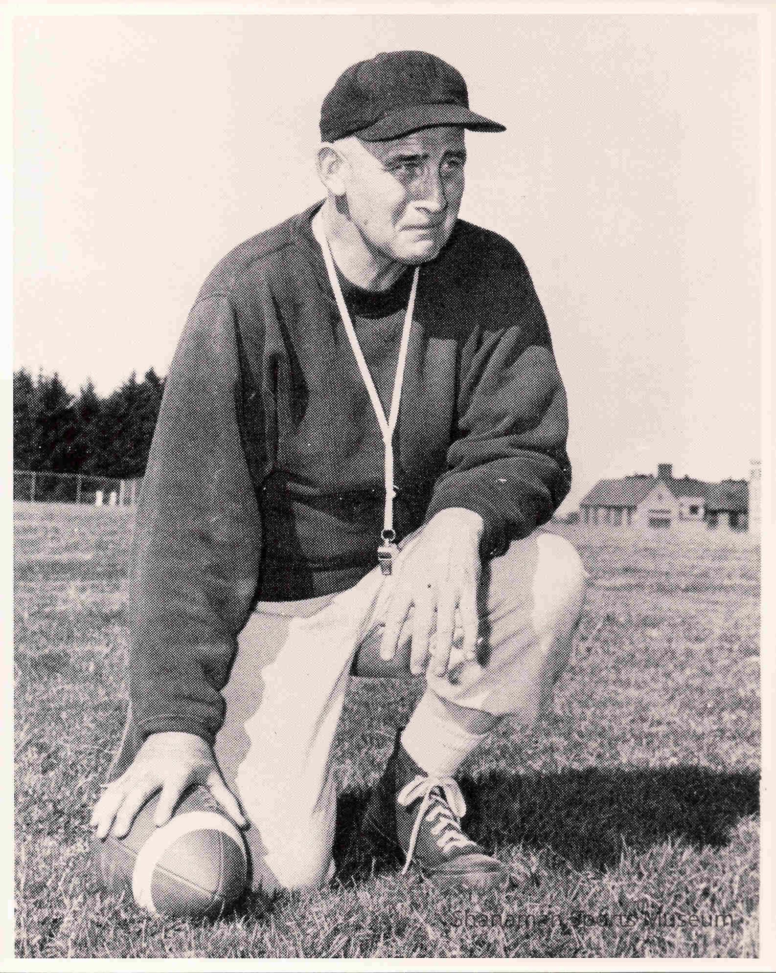 A black and white photograph of legendary coach John Heinrick kneeling down. He is known as one of the all-time great coaches in Tacoma history having managed several baseball teams to come from the area. Heinrick coached the 1934 Pacific Match team and the Johnson Paint team that played in the 1937 National Baseball Congress tournament; this was the first time a Tacoma based team traveled beyond the West Coast to participate in a national tournament. Heinrick had an extensive career in the area coaching the semipro Tacoma Tigers, serving as president of the City League, served as athletic director at Stadium High School as well as spent time as a coach and athletic director at the University of Puget Sound.Lexicon