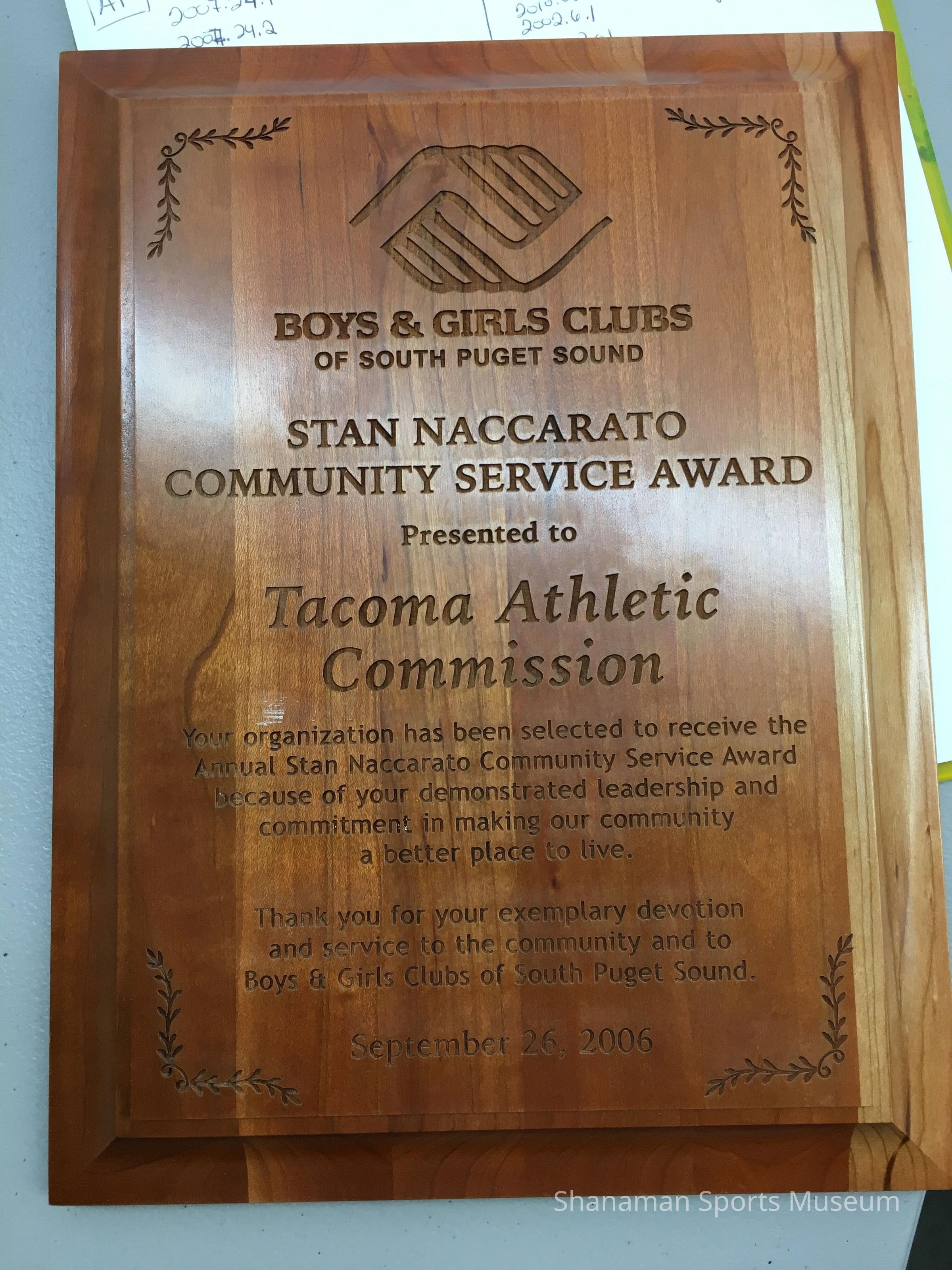 A wood plaque from the Boys & Girls Club of South Puget Sound for the Stan Naccarato Community Service Award was presented to the Tacoma Athletic Commission on September 26, 2006.