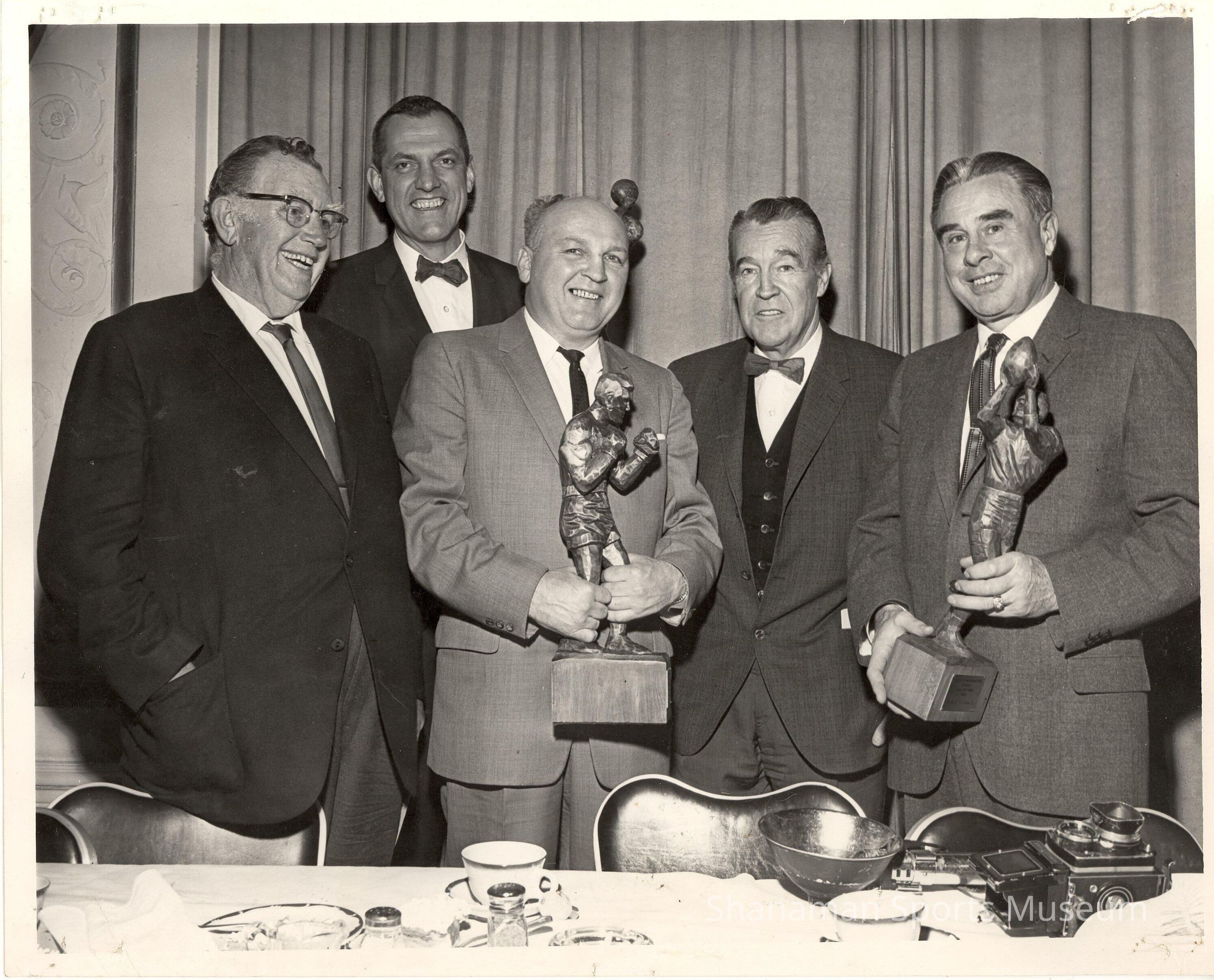 Movie star Andy Devin (far left) and NBA all-star Jack Nichols (second from left) stand with three other men and pose for a black-and-white photo at the annual Tacoma Athletic Commission's annual hall of fame induction in the 1960s. After playing at the University of Washington, Nichols played nine seasons in the NBA, scoring 5,245 points in his career. He played on the Boston Celtics 1957 championship team. Devine, with his raspy voice, played in a number of cowboy movies and TV shows. He's best remembered for his role as Cookie, who was Roy Rogers sidekick in 10 cowboy movies. He also appeared in a movie with John Wayne and the Stagecoach in 1939 and the Man Who Shot Liberty.Relationships