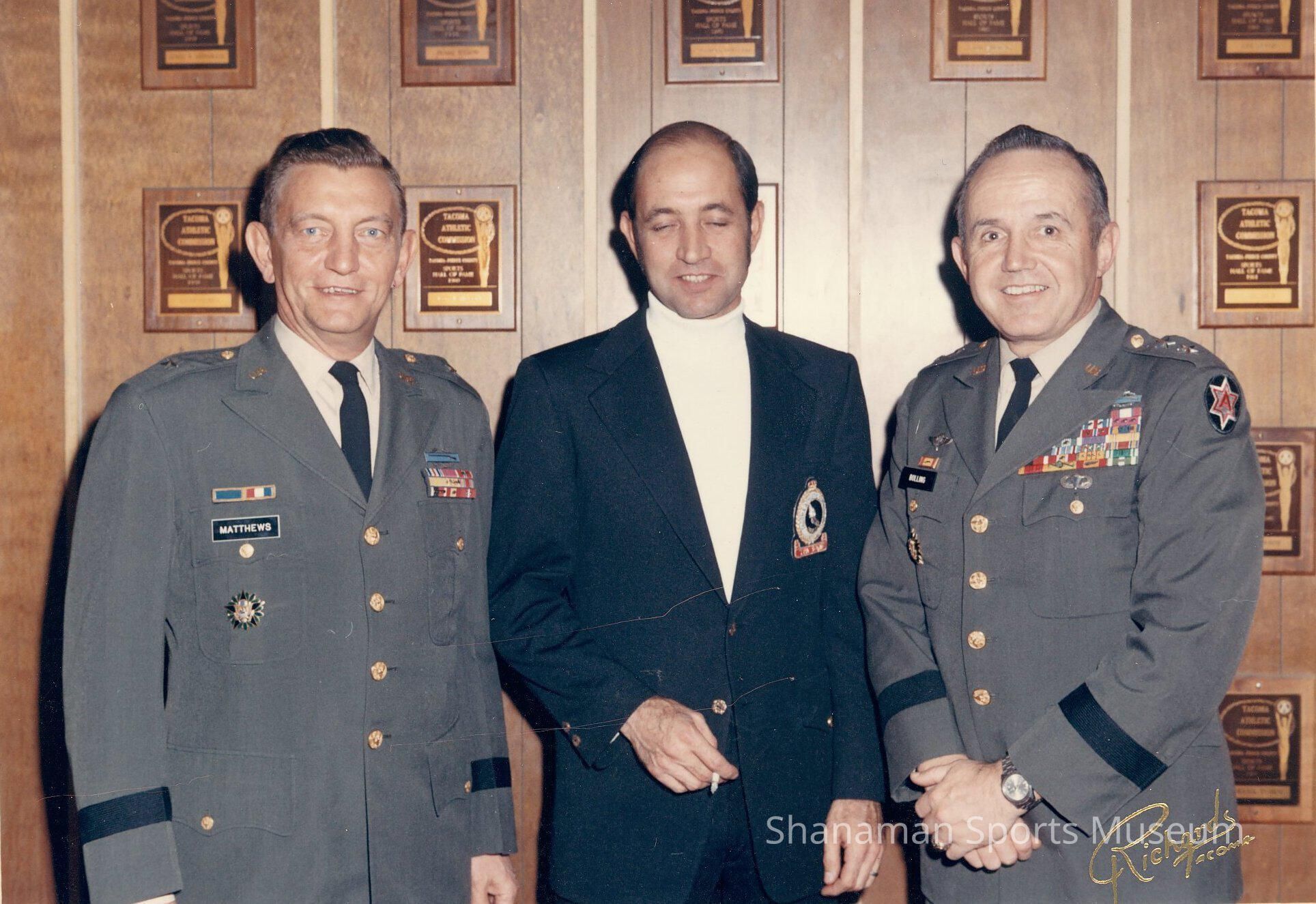 Photo of three men, two in army uniforms, Tom Paine in a TAC coat- late 60's early 70's