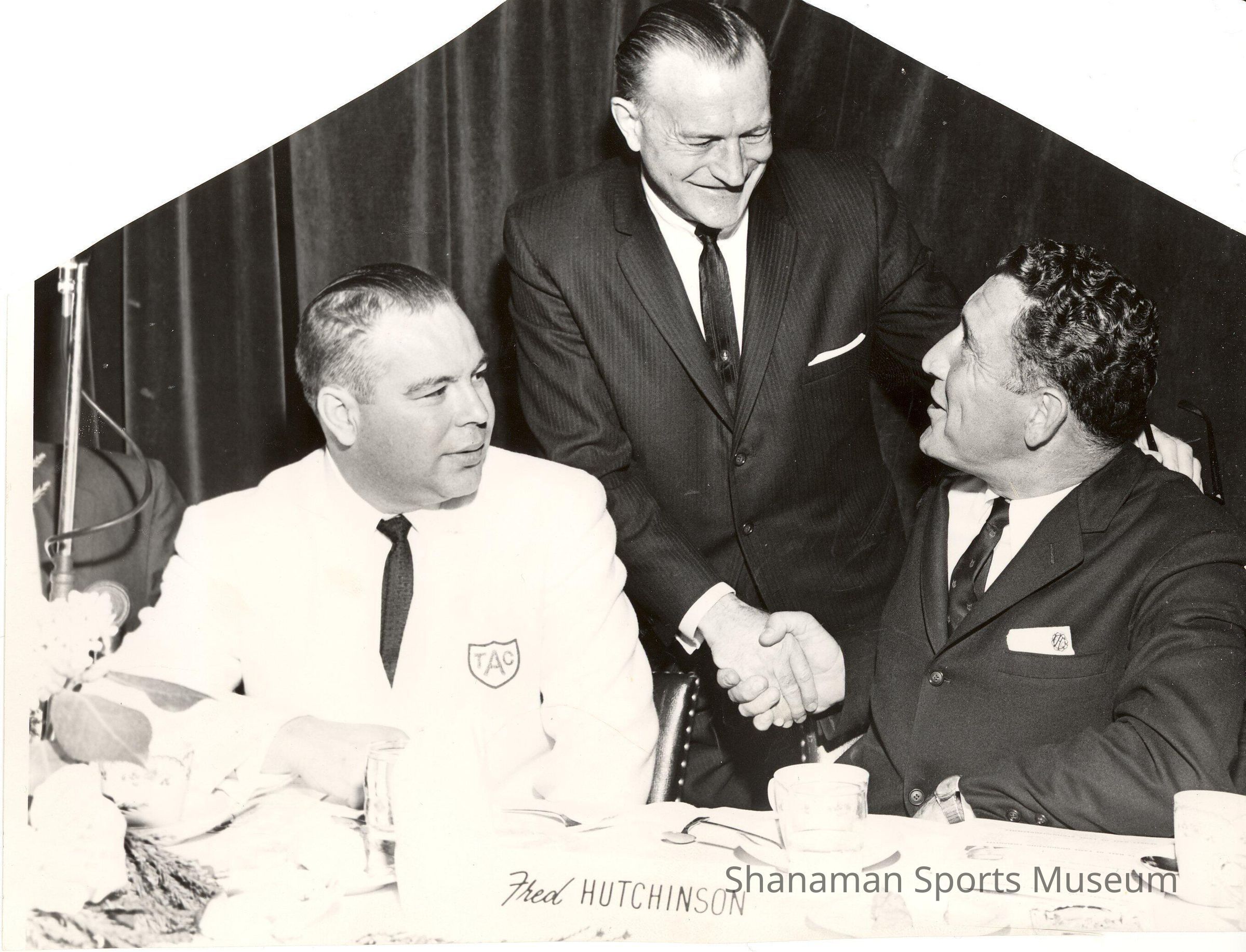 Photo of three men at table, Neil Hoff, Freddie Steele & Freddy Hutchinson