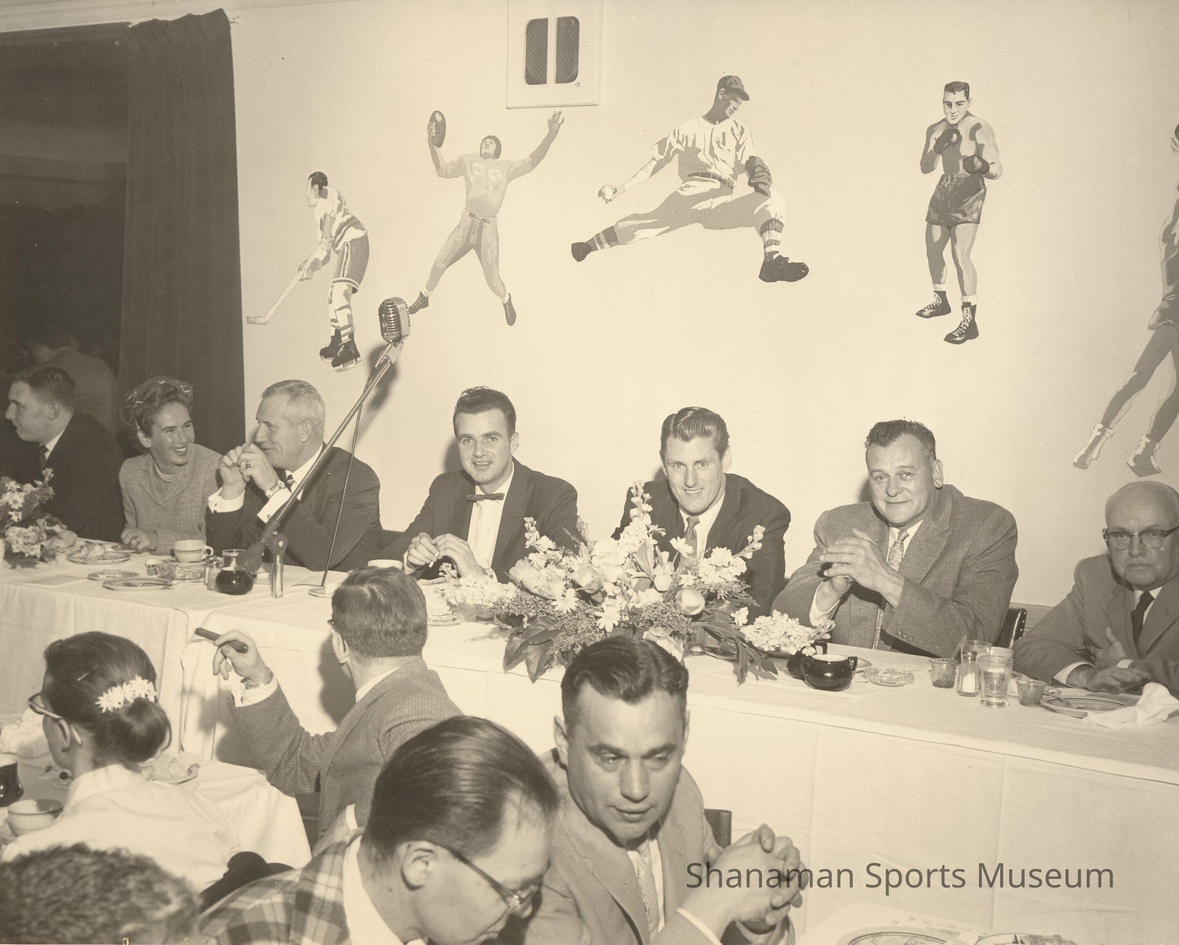 Sports icons share the head table at a Tacoma Athletic Commission event. Tacoma’s Gretchen Kunigk Fraser, left, was the first American to win an Olympic gold medal in alpine skiing. She won gold in the slalom and silver in the combined at the 1948 Olympics in St. Moritz, Switzerland. Len Casanova was a Hall of Fame college football coach. He was a beloved figure at the University of Oregon where he coached the Webfoots for 16 seasons and won a Rose Bowl. Clay Huntington was a Tacoma sportscaster and civic leader. Elroy “Crazy Legs” Hirsch was a football legend for the Los Angeles Rams who was elected into the pro and college football halls of fame. And Tacoma’s Bob Johnson was an eight-time MLB all-star who played for the Philadelphia Athletics, Washington Senators and Boston Red Sox.