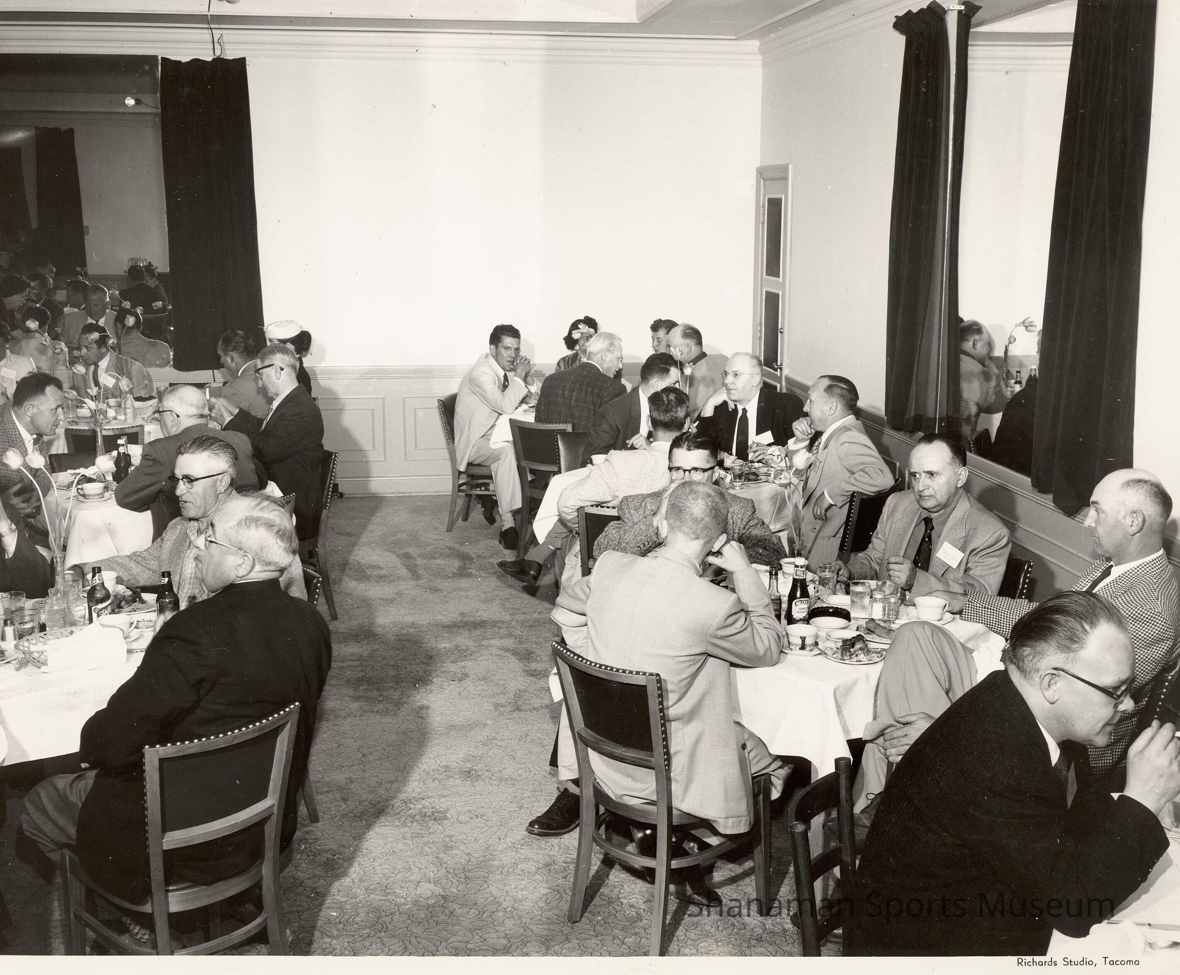 Here is a black-and-white photo of Tacoma Athletic Commission's Sports Hall of Fame banquet, which has become a popular annual event. It's a salute to the star performers of yesterday and today. For 75 years, the Tacoma Athletic Commission has been a major supporter of amateur sports in Pierce County. They have raised and donated more than $6 million to local sports. The TAC began its hall of fame inductions in 1957. Clay Huntington and Dan Walton were the TAC's sports hall of fame committee's co-chairmen in 1957.Relationships