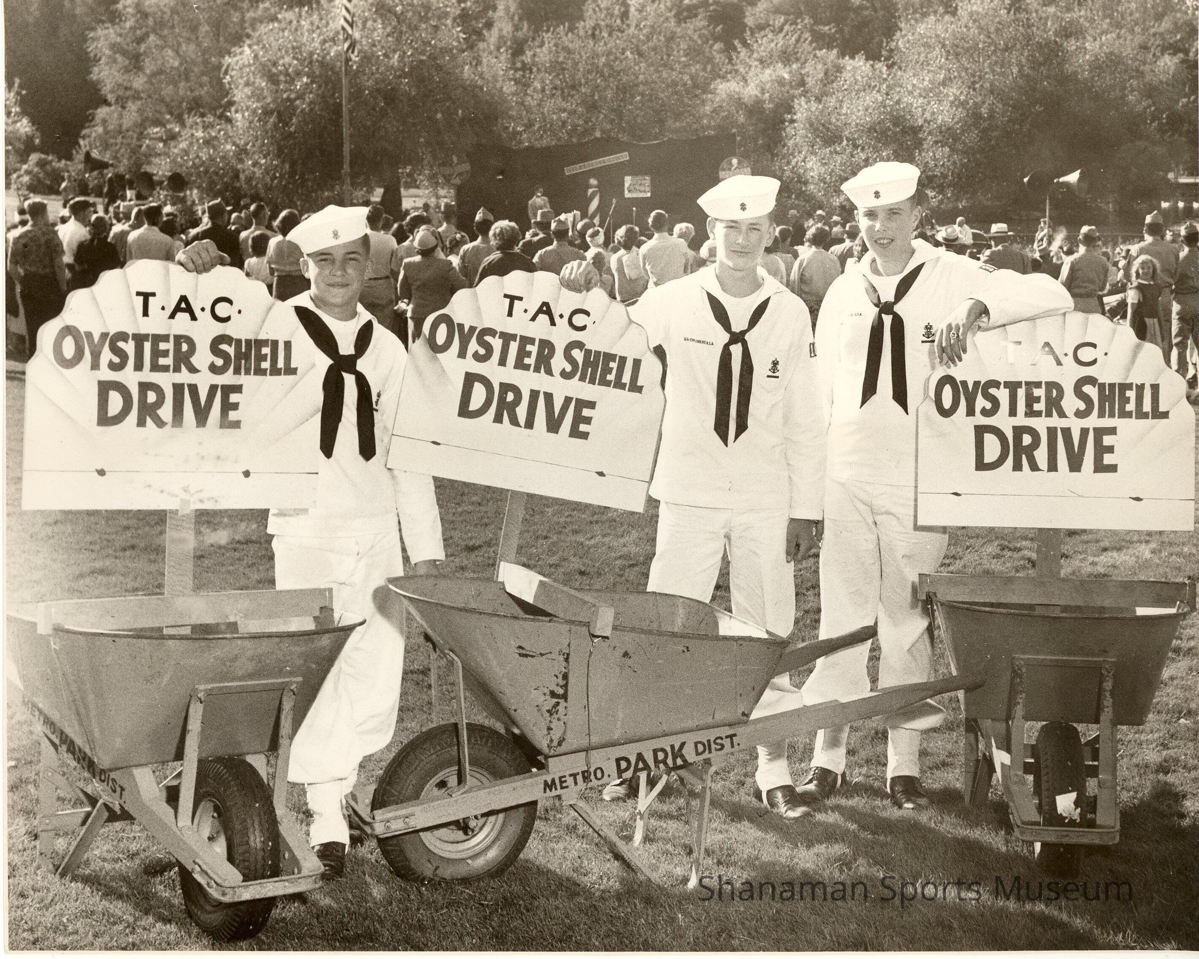 Three sailors pose with Metro Parks Tacoma wheelbarrows at a Tacoma Athletic Commission fundraiser. The Tacoma Athletic Commission started as the Tacoma War Athletic Commission in 1942 and has been supporting and promoting sports in the Tacoma area ever since.Relationships