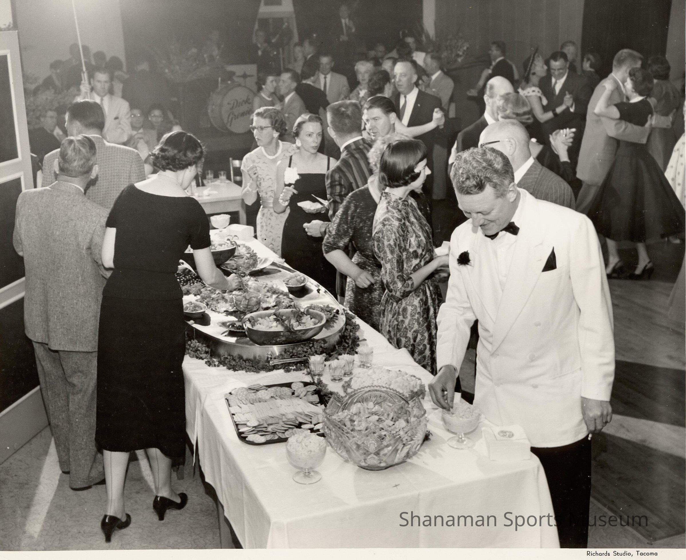 Photo of Sports Hall of Fame Banquet table with Charles Larsen, pres. of NBA (boxing) at end of the tableLexicon