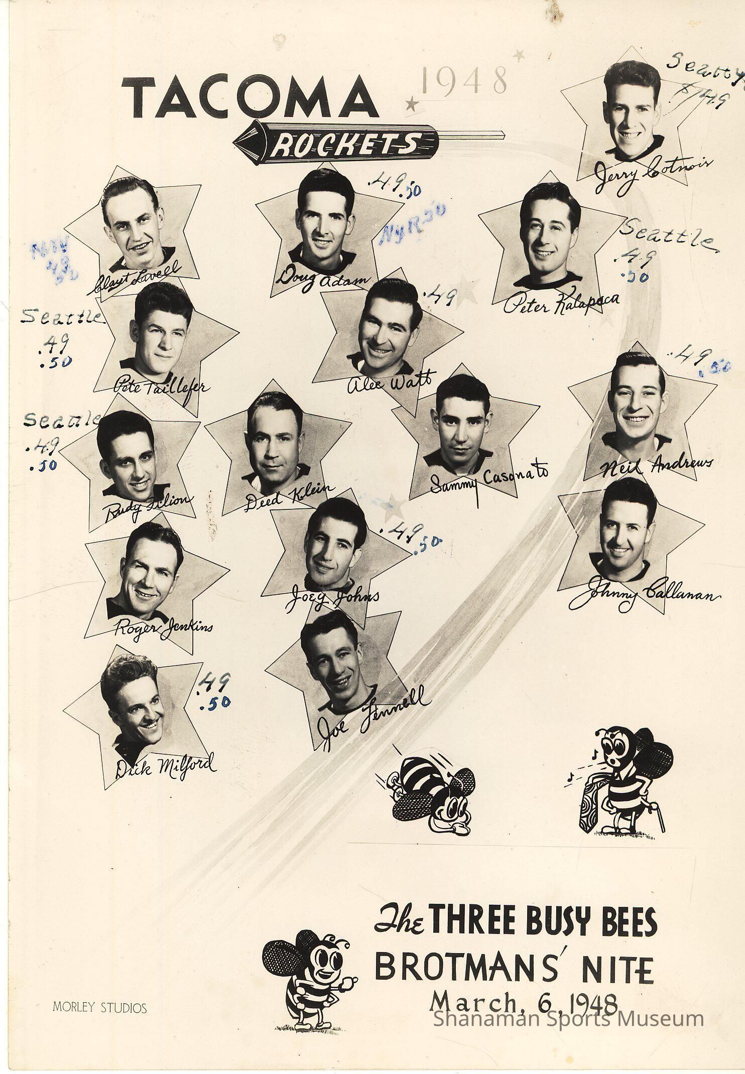 An original print collage of the 1948 Tacoma Rockets hockey team is signed by the players on March 6, 1948. The Rockets were a professional team that played in Tacoma from 1946 to 1953. Tacoma played in the Pacific Coast Hockey League until becoming a member of the Western Hockey League during the 1952-53 season and relocating to the Tacoma Ice Palace.