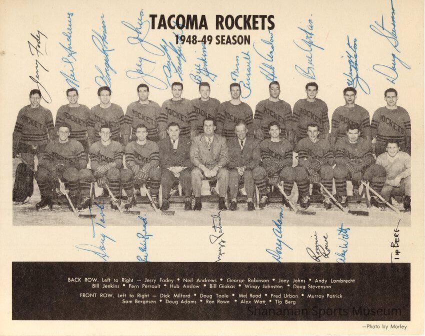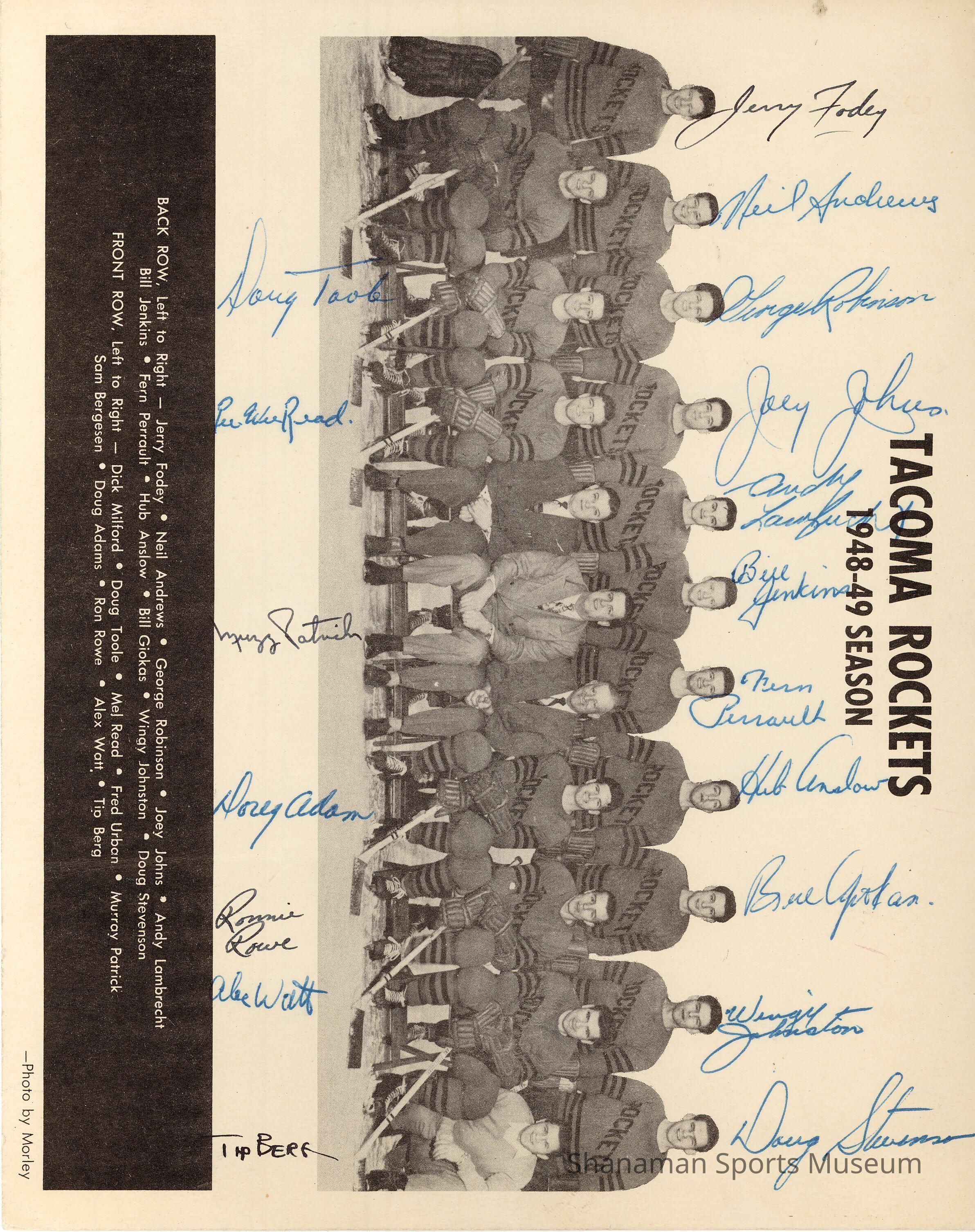 A printed black and white team photo shows the 1948-49 Tacoma Rockets hockey team names all of its players. The Rockets were a professional team that played in Tacoma from 1946 to 1953. Tacoma played in the Pacific Coast Hockey League until becoming a member of the Western Hockey League during the 1952-53 season and relocating to the Tacoma Ice Palace.