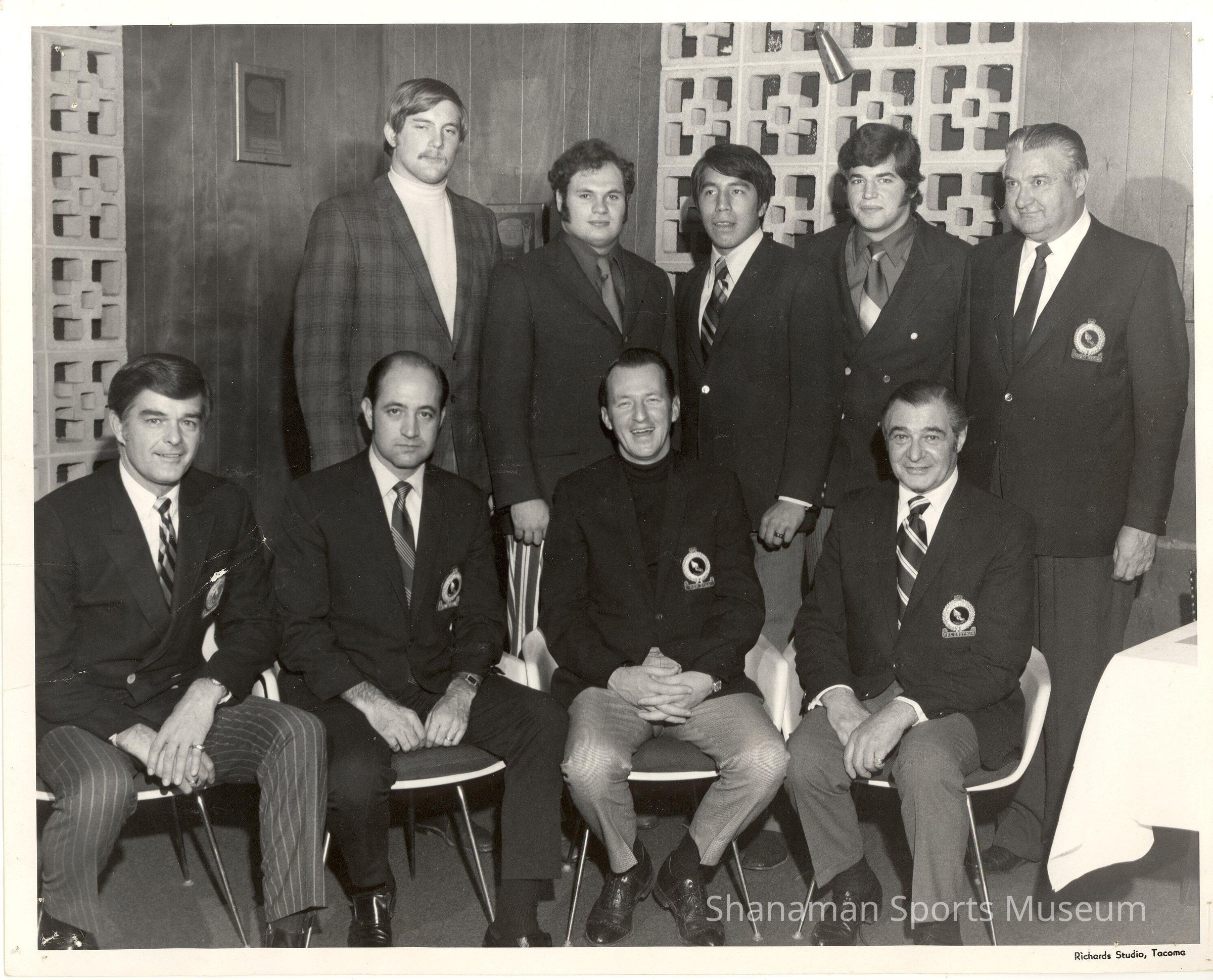 PGA golfer Ken Still poses for a picture with several members of the Tacoma Athletic Commission and some student/athletes from the University of Washington back in the 1960s. Still, who was born in Tacoma in 1935, was a professional golfer on the PGA Tour for 23 years and later on the Senior PGA Tour for 11 years. He won three PGA tournaments and his best finish in a major tournament was sixth in the Masters in 1971. In this black-and-white photo, Still is sitting in the front row and is the third one from the left. Hank Semmeran is on the left, then Paine, then Still and then Hal Brothan. Semmeran was a former president of TAC. Still was inducted into the Tacoma-Pierce County Sports Hall of Fame in 2005.