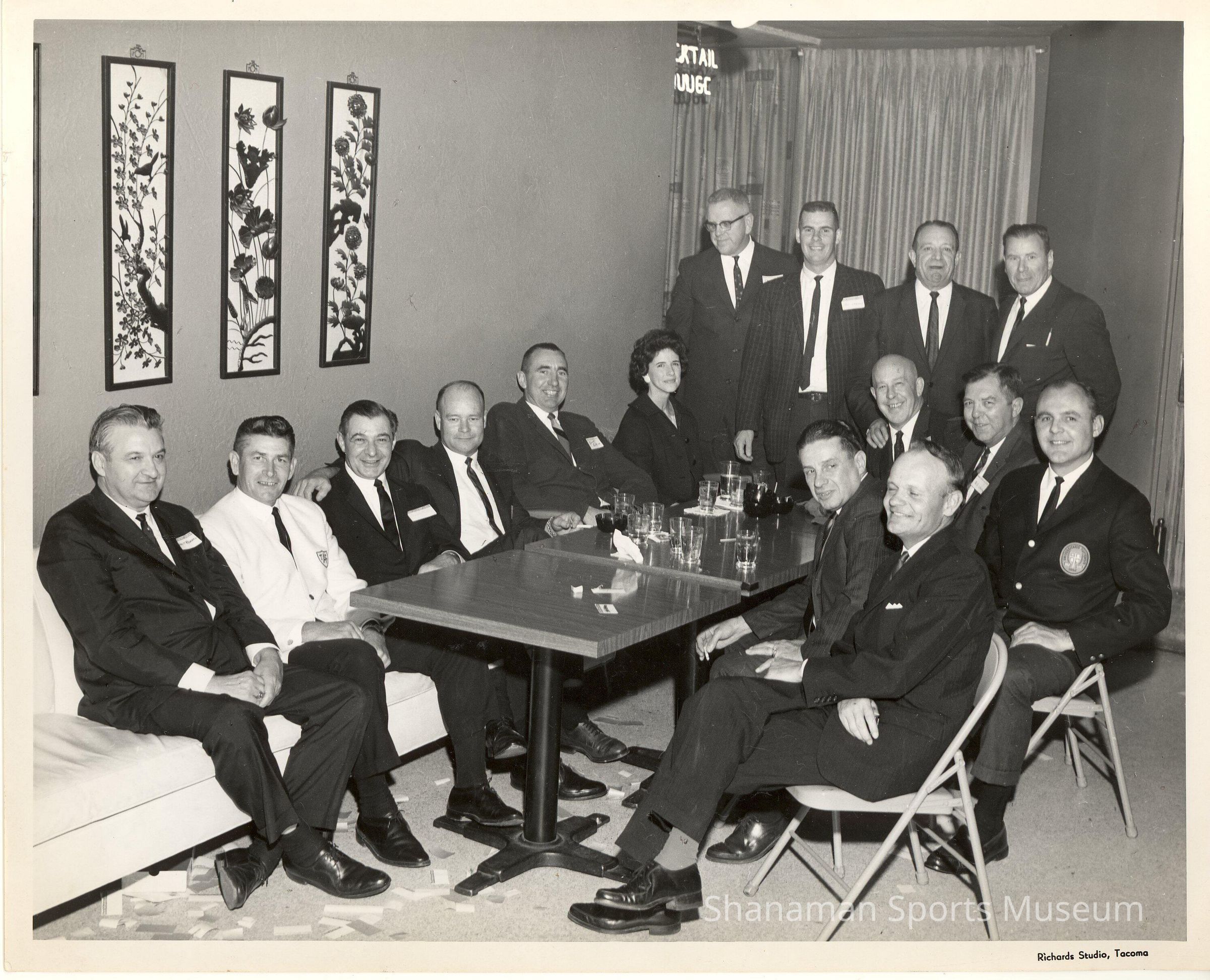 Fifteen members of the Tacoma Athletic Commission pose for this black-and-white photo taken back in the 1950s. Since 1945, the Tacoma Athletic Commission has been suppurtive of amateur sports and youth sports in Pierce County. TAC has donated more than $6 million for local sports. In addition to its financial support, the Tacoma Athletic Commission presents annual awards for achivements in sports and academics. Their most popular award is the Athlete of the Year awards in 23 sports at 34 high schools with Columbia Bank as its sponsor. At quarterly ceremonies, over 700 students-athletes and families get together to celebrate the academic and athletic achievements of those who receive awards. TAC supports youth sports through volunteers, financial and encouraging enthusisasm.Lexicon