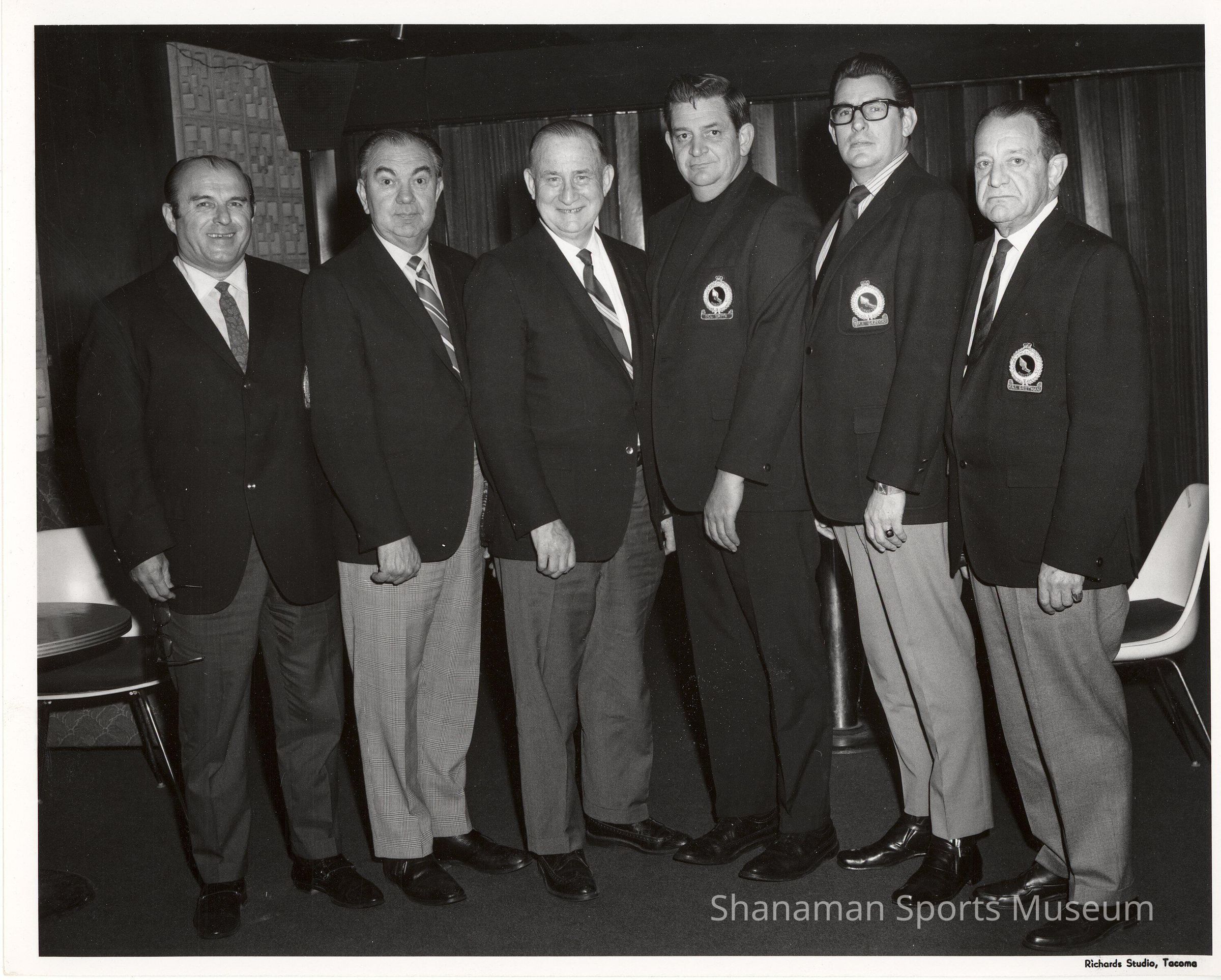 Here is a black-and-white photo of six members of the Tacoma Athletic Commission. They are: standing, George Sheriden, unidentified, John Heinrick, Del Smith, Bill Gazecki and Dill Howell. Heinrick was a legendary coach and he coached football, basketball and baseball in high school and college. His commitment spread over 51 years as a coach, umpire and athletic director. He began his successful coaching career at St. Leo's High School, which is now Bellarmine Prep, and coached there from 1927 to 1934. In 1945, he became the basketball coach at the College of Puget Sound while still coaching football at Stadium High School. He led CPS to a league title in 1948. He is considered to be one of the all-time great coaches in Tacoma. He was inducted in the Tacoma-Pierce County Sports Hall of Fame in 1959.