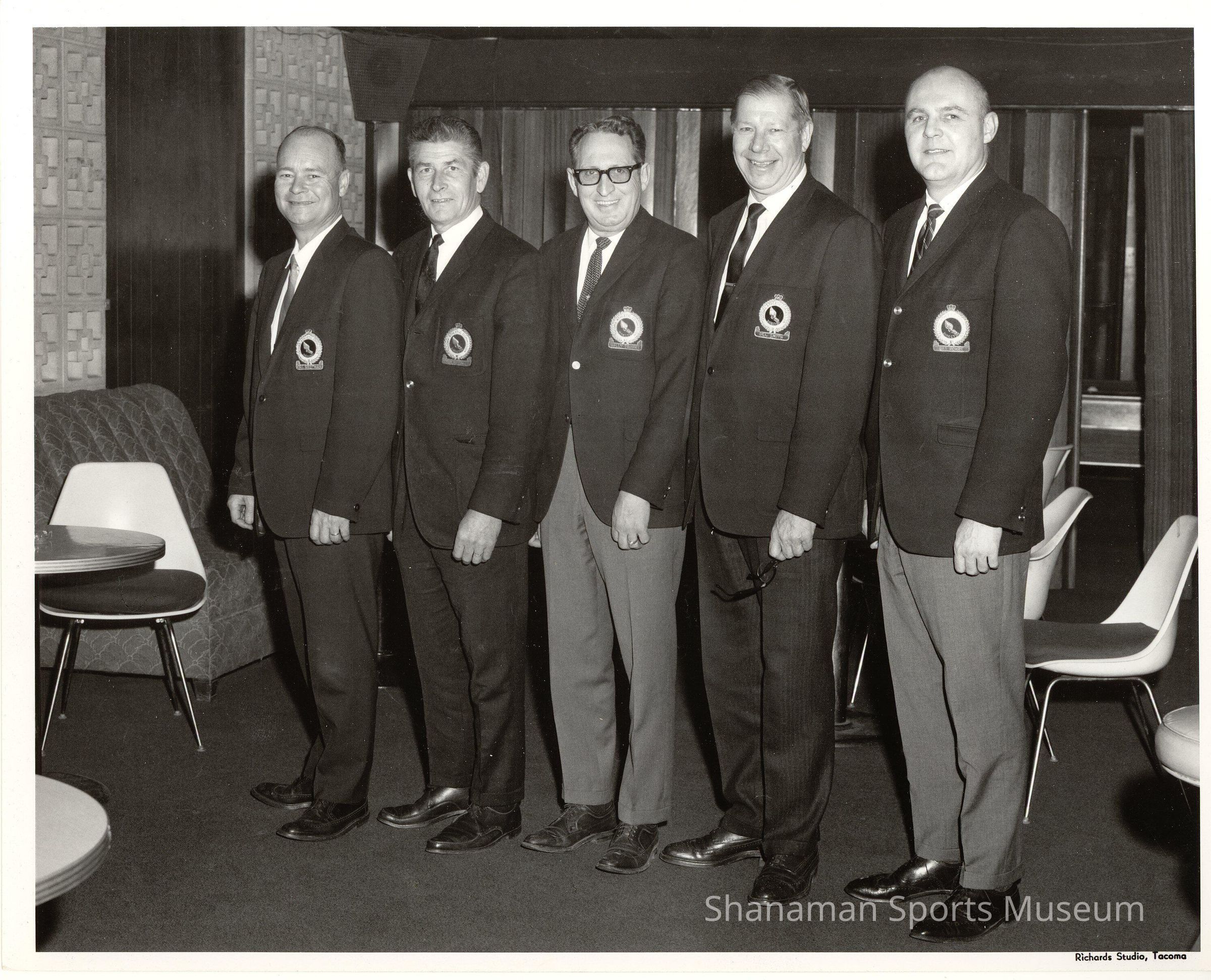 Wearing suits and ties, Marv Tommervik, far left, stands with four other members of the Tacoma Athletic Commission in this black-and-white photo. Tommervick was a two-time All-American while playing quarterback for Pacific Lutheran College in the 1940s. Later, Tommerivick was a college football referee for 20 years and in 2013 he was inducted into the Pac-10 Football Officials Associations Field of Honor. Tommervik, who was born in 1919 and died in 2003, officiated two Rose Bowls, refereeing the classic bowl game in 1971 and 1975. The other men in this black-and-white photo from left to right are: Roger McDonald, unidentifed, Harold Tollefson and Bill Rohrs. Tollefson went on to become the mayor of Tacoma.Lexicon