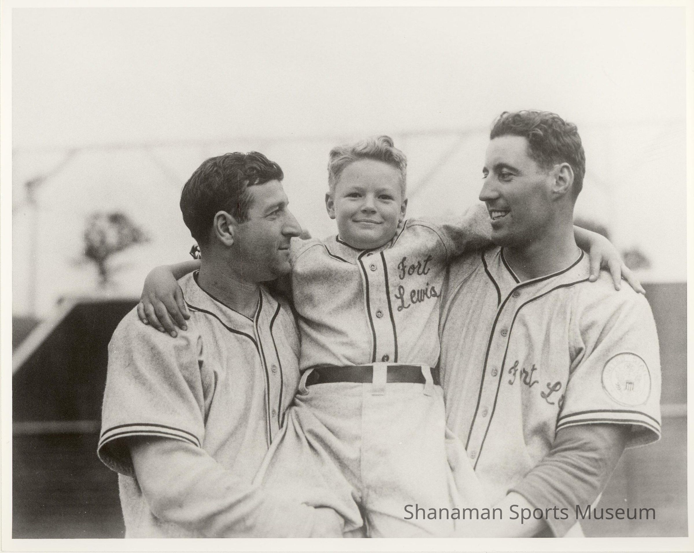 Maury Arnovich (left) and Herm Reich (right) hold young boy. Arnovich played seven years in the major leagues, mainly with the Philadelphia Phillies of the National League. Reich played in the major leagues for just three games in 1949 but played a total of 16 years in the minor leagues. He played for the Tacoma Tigers of the Western International League in 1939, played for Yakima in the Northwest League in 1955-56 and with Eugene in 1956, his final season in professional baseball. The majority of his career was spent in the Pacific Coast League with Portland and Sacramento. Herm and Maury were both stationed at Fort Lewis when this photo was taken.Lexicon