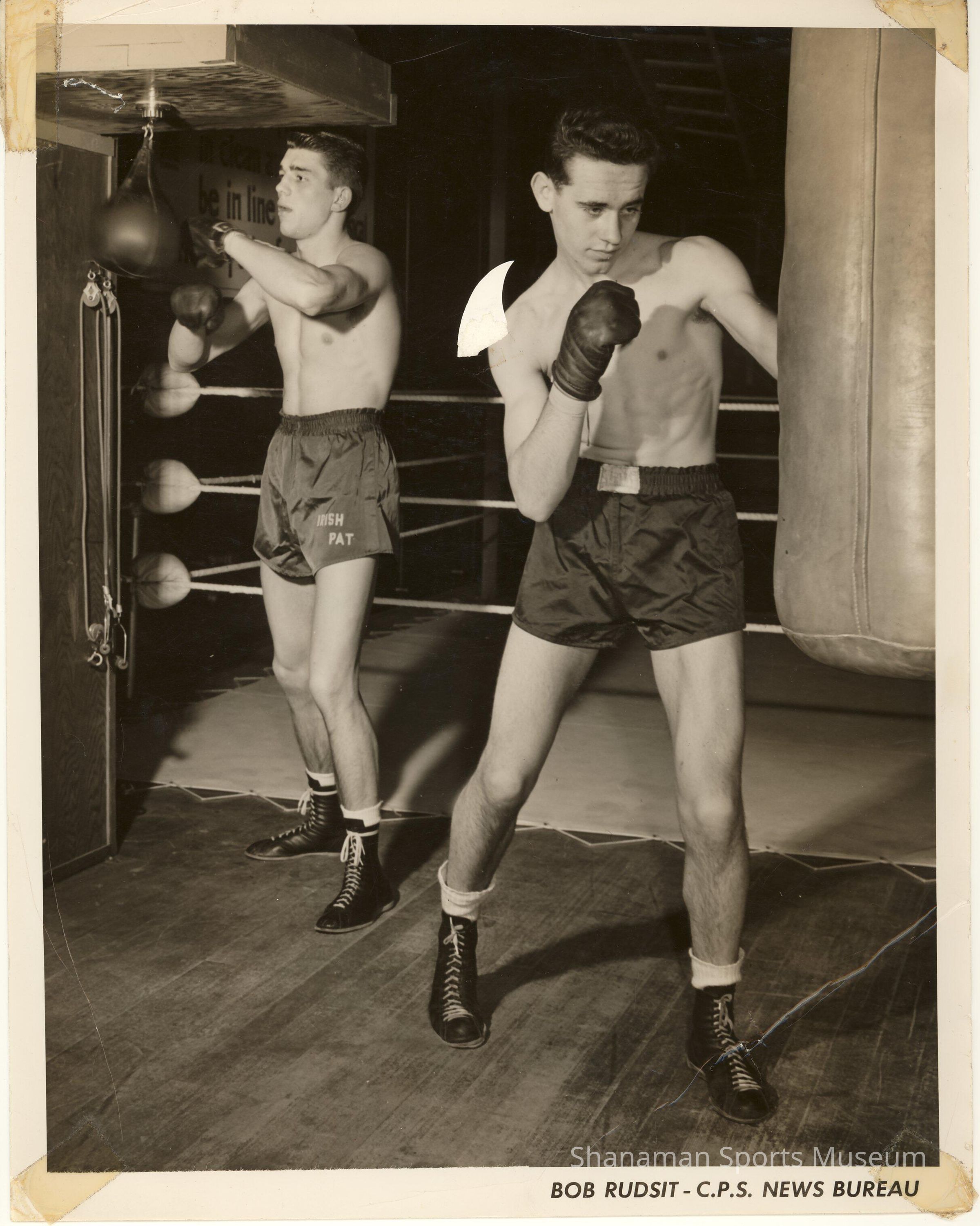 B/W original print of 2 young boxers; L=Pat McMurtry and Gary Featherstone? at punching bag. Printed below, on border: Bob Rudsit - C.P.S. News BureauRelationships