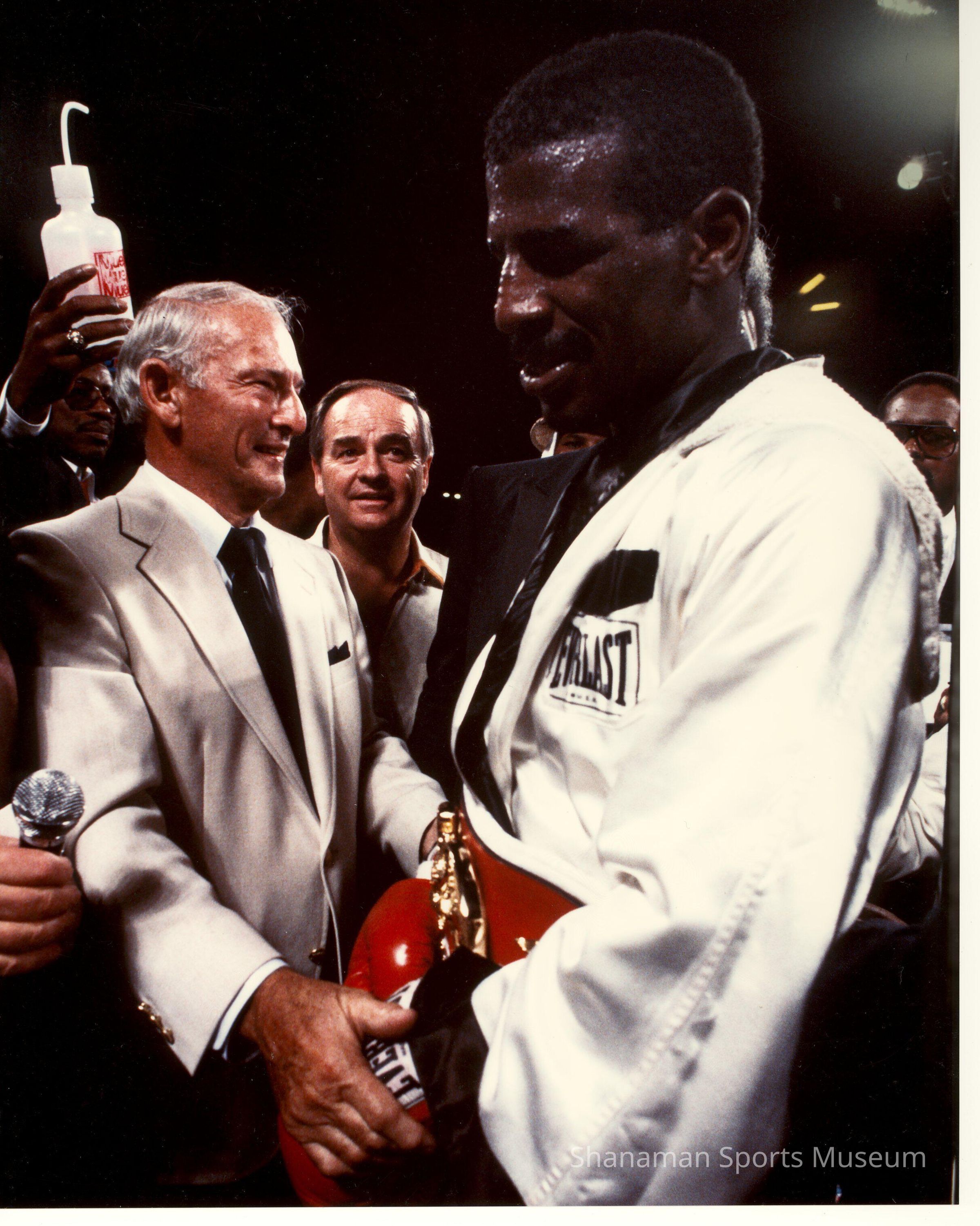 Tacoma's Jimmy Rondeau presents Michael Spinks, who is wearing the black trim robe, with the championship belt. Spinks is a two-weight world champion, holding the undisputed light heavyweight title from 1983 to 1985, and the heavyweight title from 1985 to 1988. As an amateur, he won the gold medal in the middleweight class at the 1976 Summer Olympics. Rondeau, a boxing referee from Tacoma, refereed 19 championship bouts, traveling around the world. He refereed the heavyweight championship fight against George Foreman and Kenny Norton in Venezuela in 1974. After a series of powerful punches put Norton on his back, Foreman ended up winning that fight.Lexicon