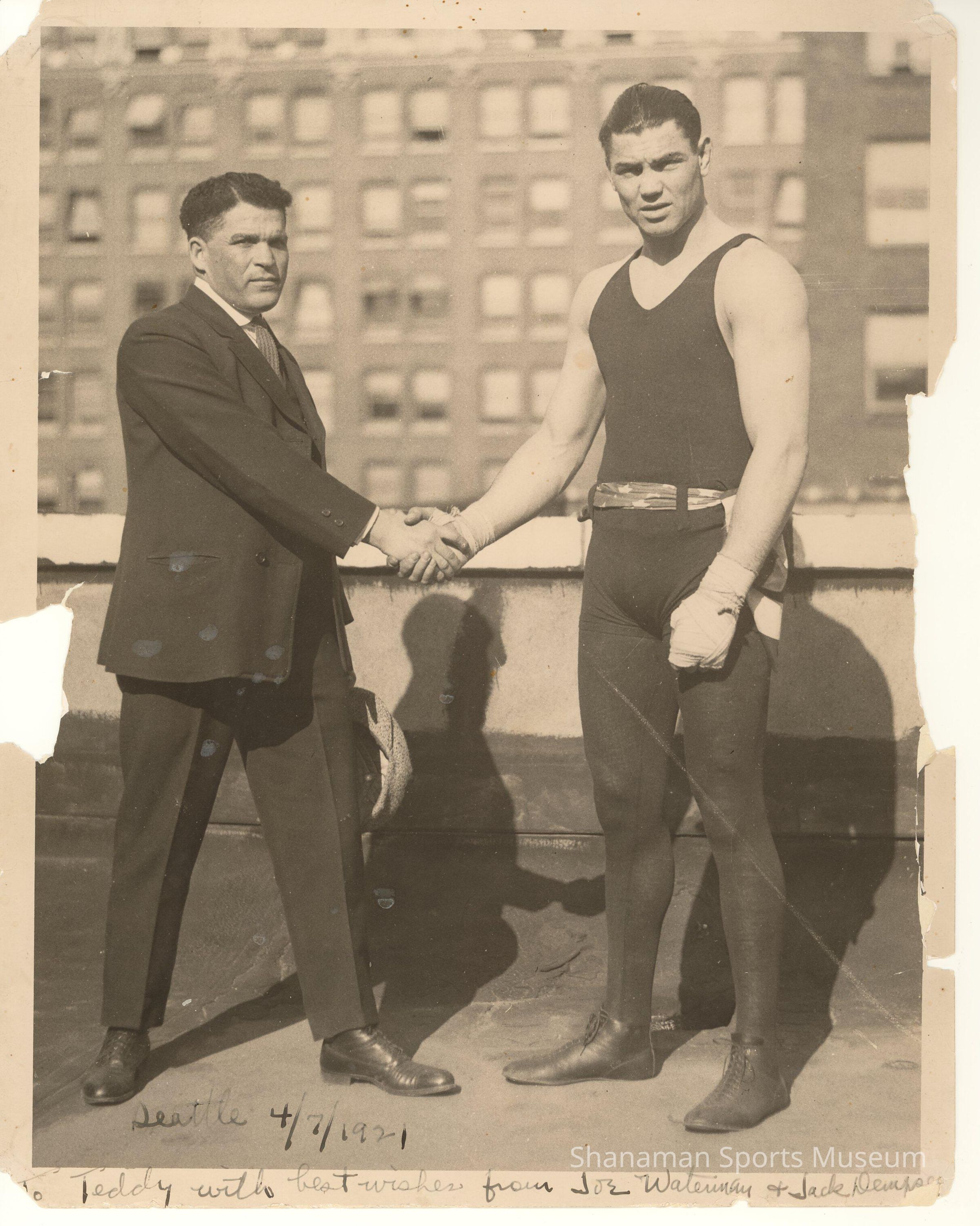 Boxer Dave Davey, right, with Ted Christian in Seattle, Washington. During his career, Davey did a lot of tours and PR campaigns including to help sell War Bonds during World War II. Davey spent a nine year career from 1946 to 1955, where the Tacoma born heavyweight went 33-5-2 overall record with 11 knockouts. Autographed "To Teddy -- Seattle 1921"Lexicon