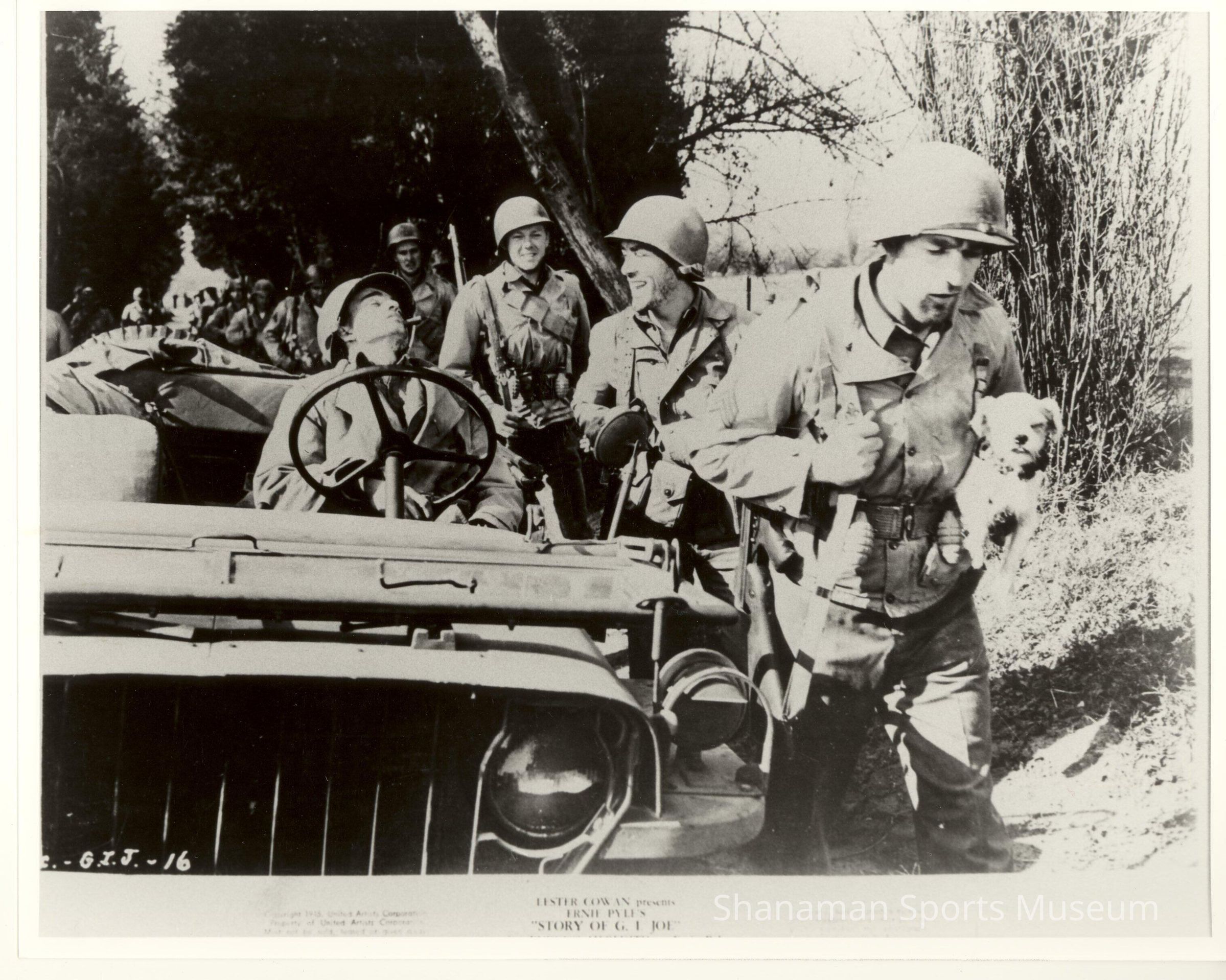 B/W copy print of a movie scene that starred boxer Freddie Steele. Scene portrays men in combat walking alongside jeep;Movie="GI Joe"Lexicon