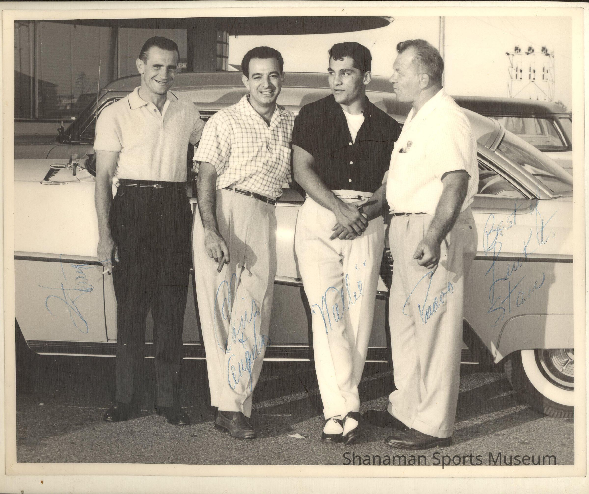 The four men in this photo who are leaning against a car signed this photo. Joe Macaluso donated the photo.