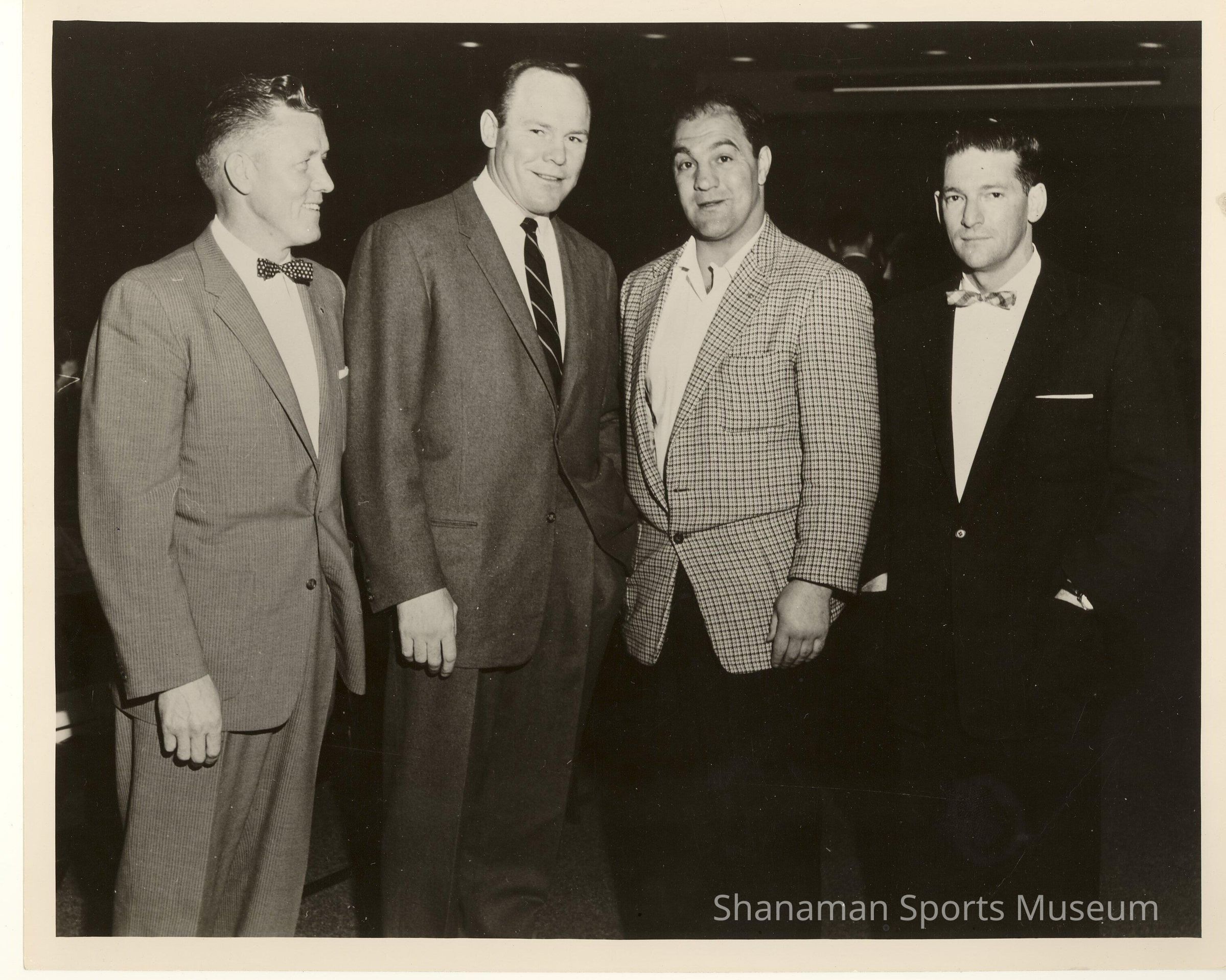 Two of Bremerton's sons Whitey Domstad, far left, and Jimmy Rondeau, far right, standing next to Peter Radamaker and Rocky Marciano. Domstad would spend a 40 year career working as a referee and judge for the Washington State Athletic Commission, while also serving as Bremerton's mayor from 1955 to 1964. Rondeau served as a referee from 1946 to 1968 where he refereed every Golden Gloves tournament in Tacoma, Seattle and Portland during his career.Lexicon