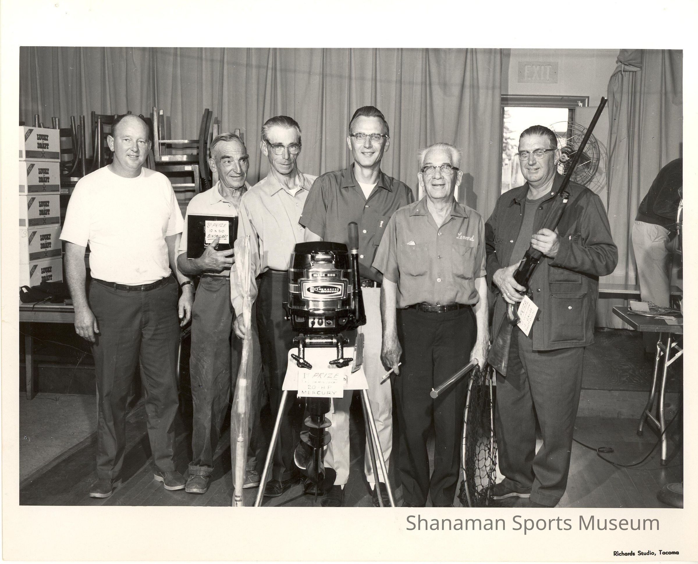 This is a black-and-white photo of the six winners of the Tacoma Athletic Commission's salmon derby fundraiser back in the 1960s. The salmon derbys were part of TAC's fundraising to support local youth sports. Since 1945, the TAC has been a major supporter of amateur sports and the youth in Pierce County. With a membership of now more than 275 enthusiastic supporters, they have raised and donated more than $6 million to local sports programs over the years. The TAC is dedicated to youth and sports and stages awards ceremonies for local high school and college athletes. A popular, ongoing presentation has been the annual Athlete of the Year awards that are given in 23 sports at 34 high schools. More than 700 student-athletes, families and friends gather quarterly to celebrate the academic and athletic awards that are presented the TAC. The TAC is actively involved in youth sports with volunteers, financial assistance, publicity, encouragement and support.Lexicon