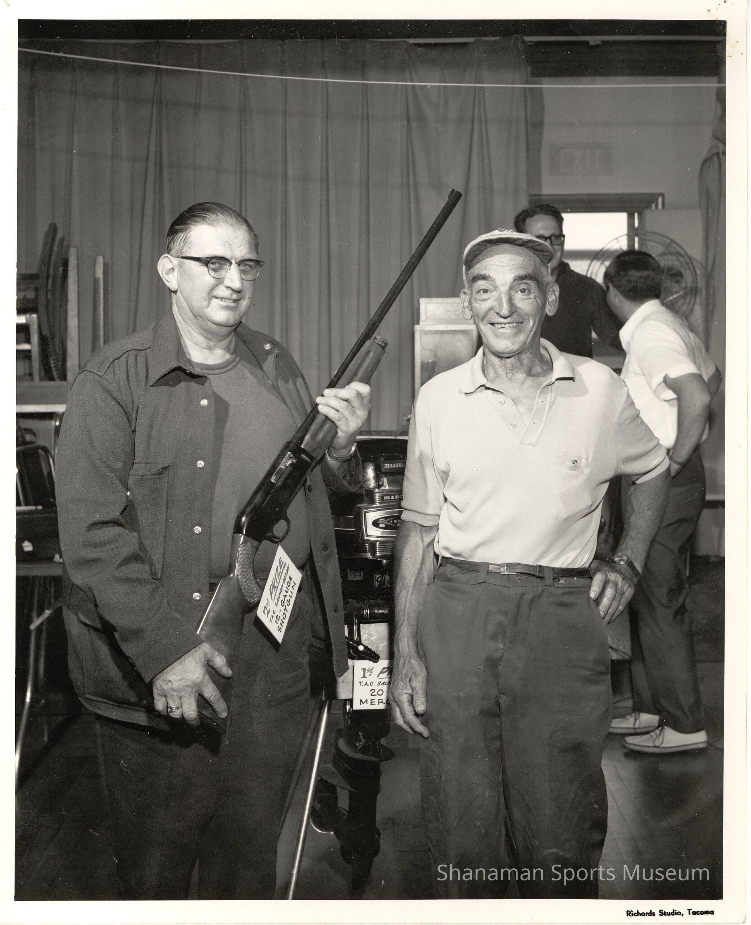Second-place finishers at a Tacoma Athletic Commission Salmon Derby smile as they display their prize, a 12-gauge shotgun. Behind them is a 20-horsepower Mercury boat engine that went to the derby winners. The TAC has a long history of sponsoring sports and entertainment events and supporting youth and recreational sports in Tacoma and Pierce County. The organization's events included Golden Gloves boxing tournaments, Fourth of July fireworks shows, water ski races between Tacoma and Seattle, college and high school track meets, bowling tournaments and more.Lexicon