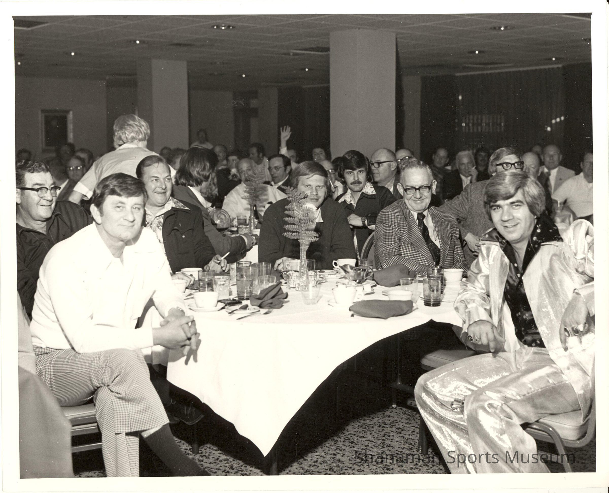 B/W original print of many men, seated at dining tables in a banquet room. Joe Macaluso (R). Cadillac Dinner, sponsored by TACRelationships