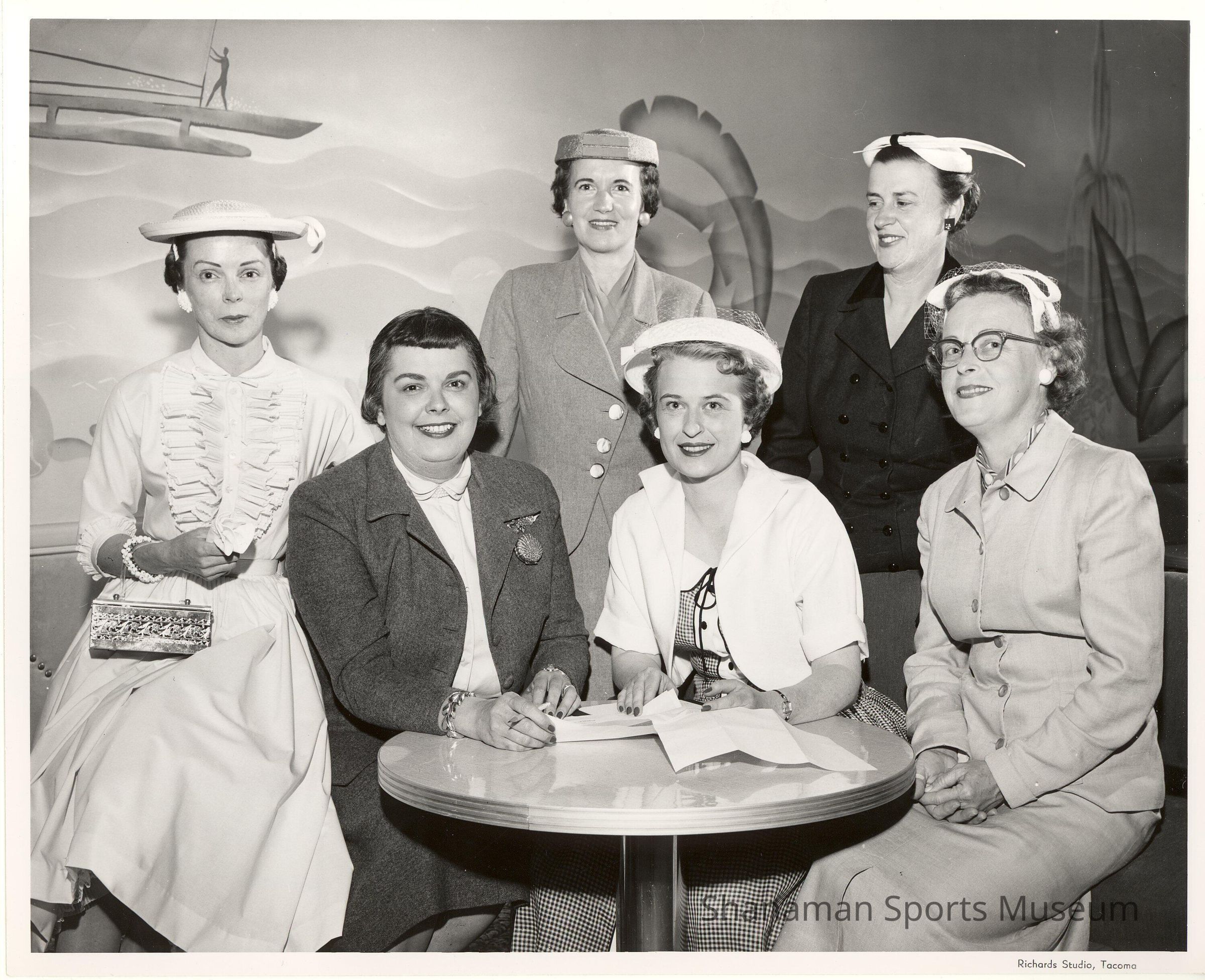 B/W original photo of 6 women, 4 seated around a small round dinette table. 2 other women stand in back. TAC's women's AuxiliaryRelationships