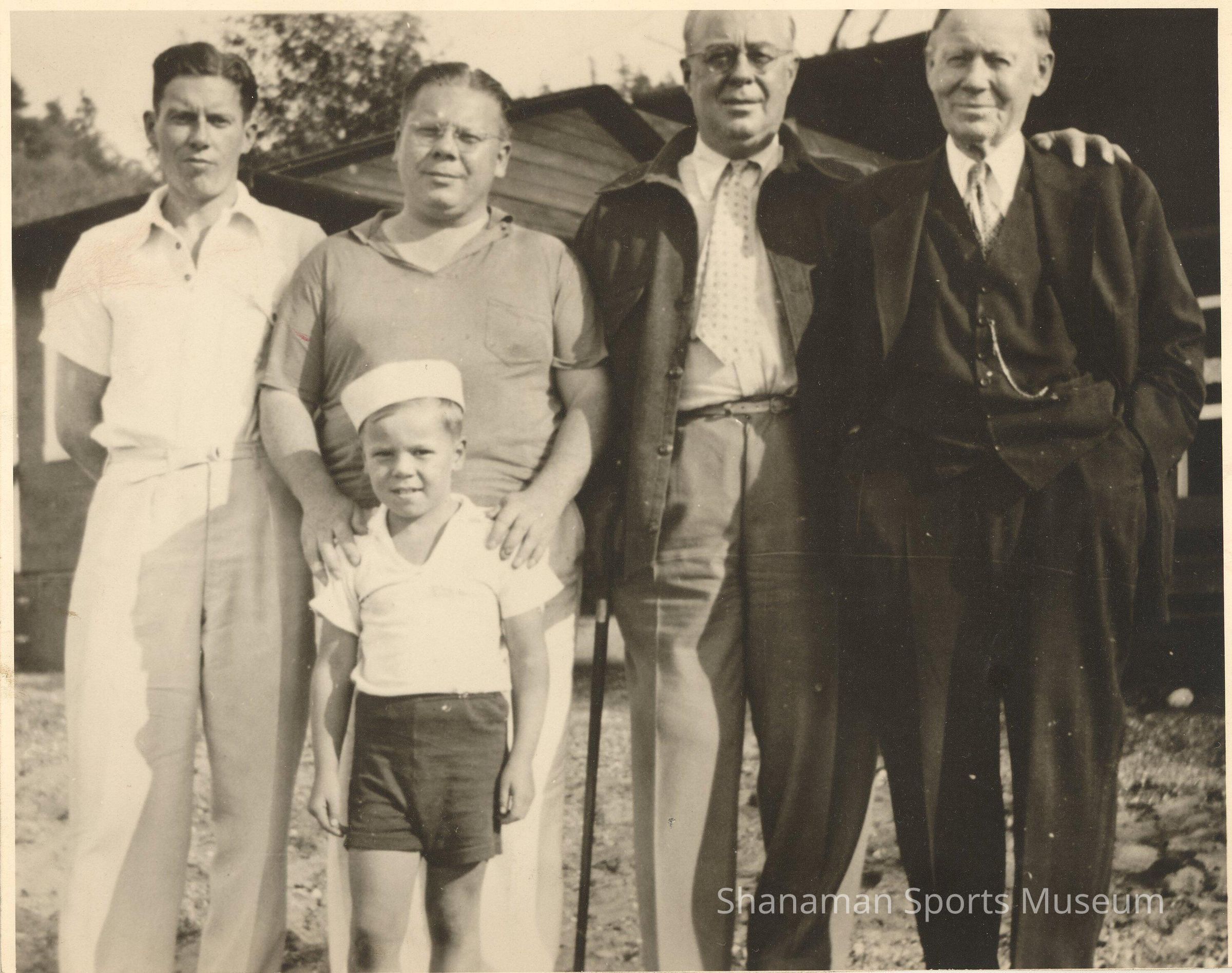 B/W original print of 4 men standing with a small boy (Ben Cheney?) wearing a white cap. Roof lines of buildings visible in background. Probably taken in South Bend.Relationships