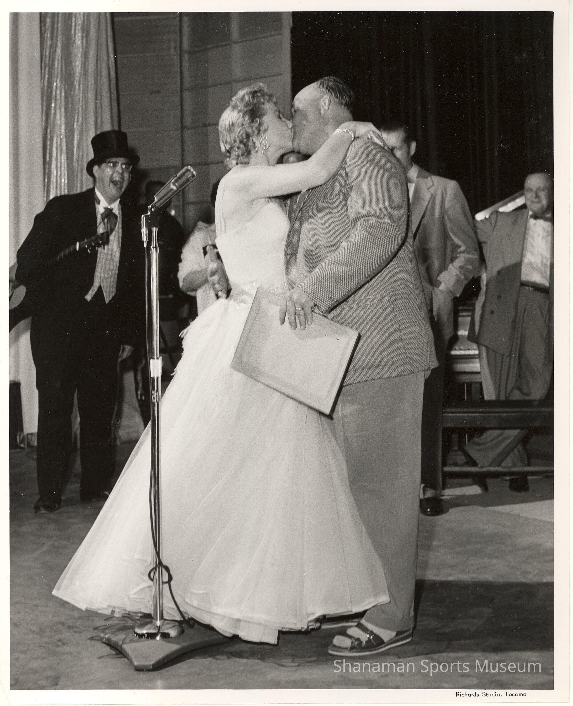 B/W original print of Bert Thomas embracing a woman in a long white gown on stage. A man with a guitar and top hat stand to back.Relationships