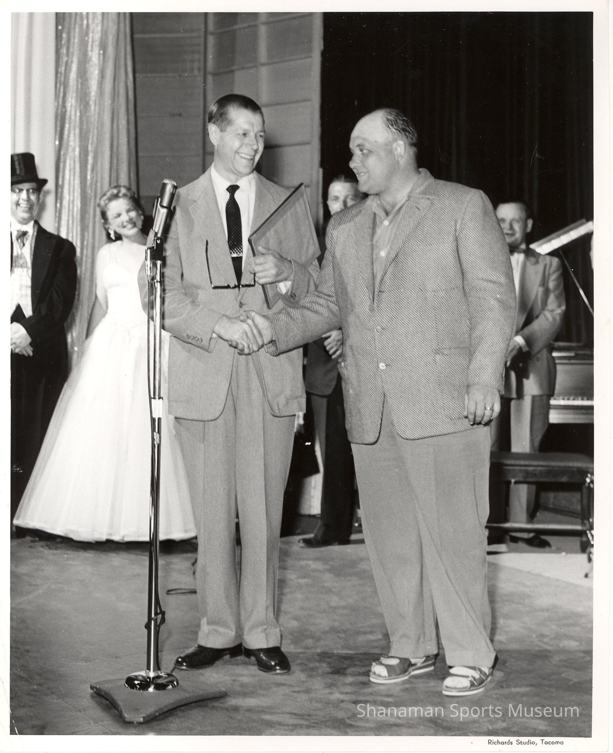 B/W original print of Harold Tollefson shaking hands with Bert Thomas. Woman in long white dress behind.