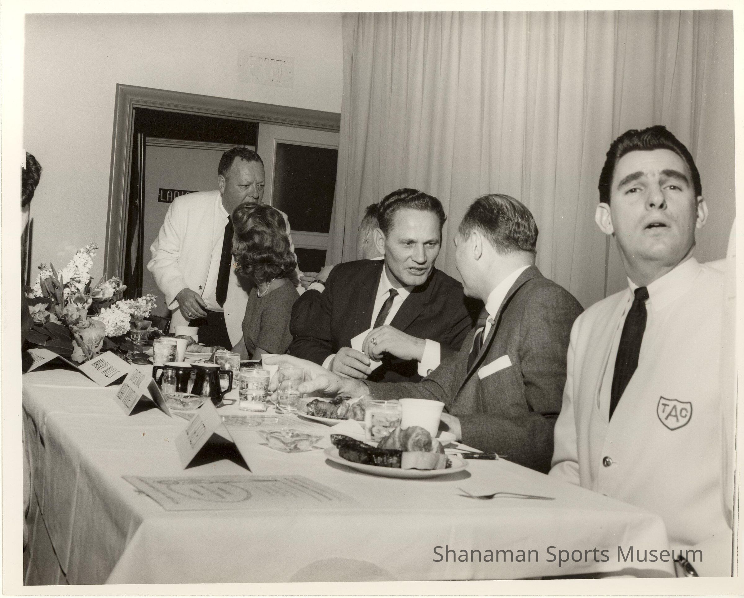 B/W original print of the head table at a TAC event. Ben Cheney to (L); B.Gazecki to Right. Albert Rosselini to L of Bill.