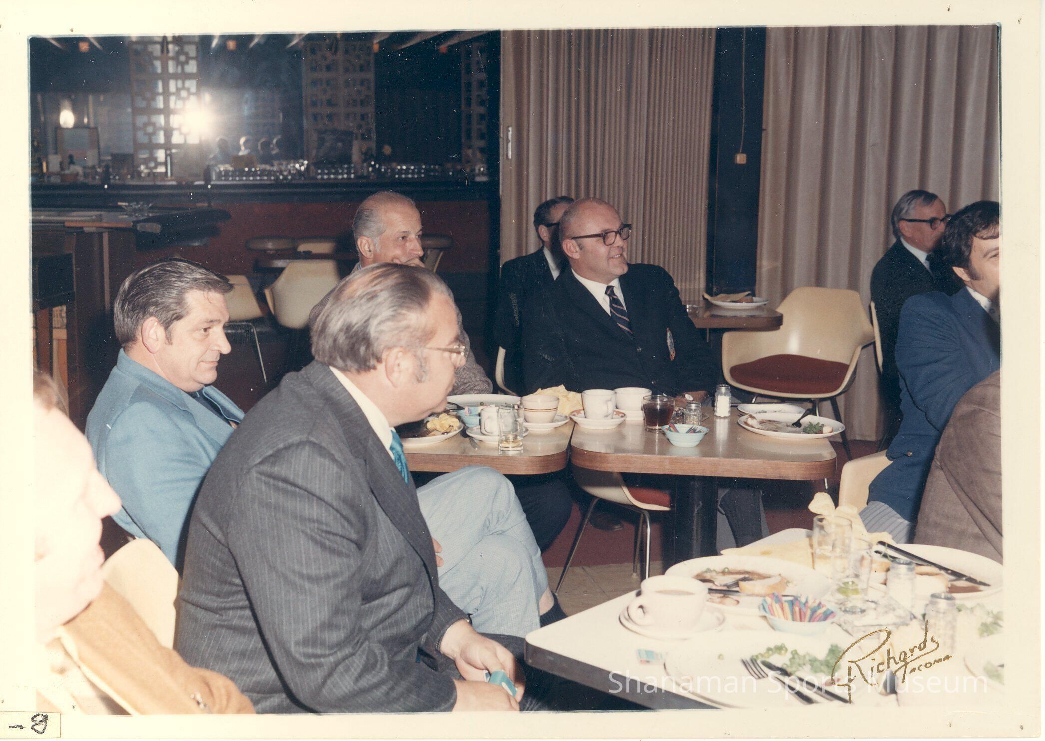 original color print of men seated at tables in a restaurant. Front: Neil Hoff, Del Smith, John Cologerou, Bill Roars.